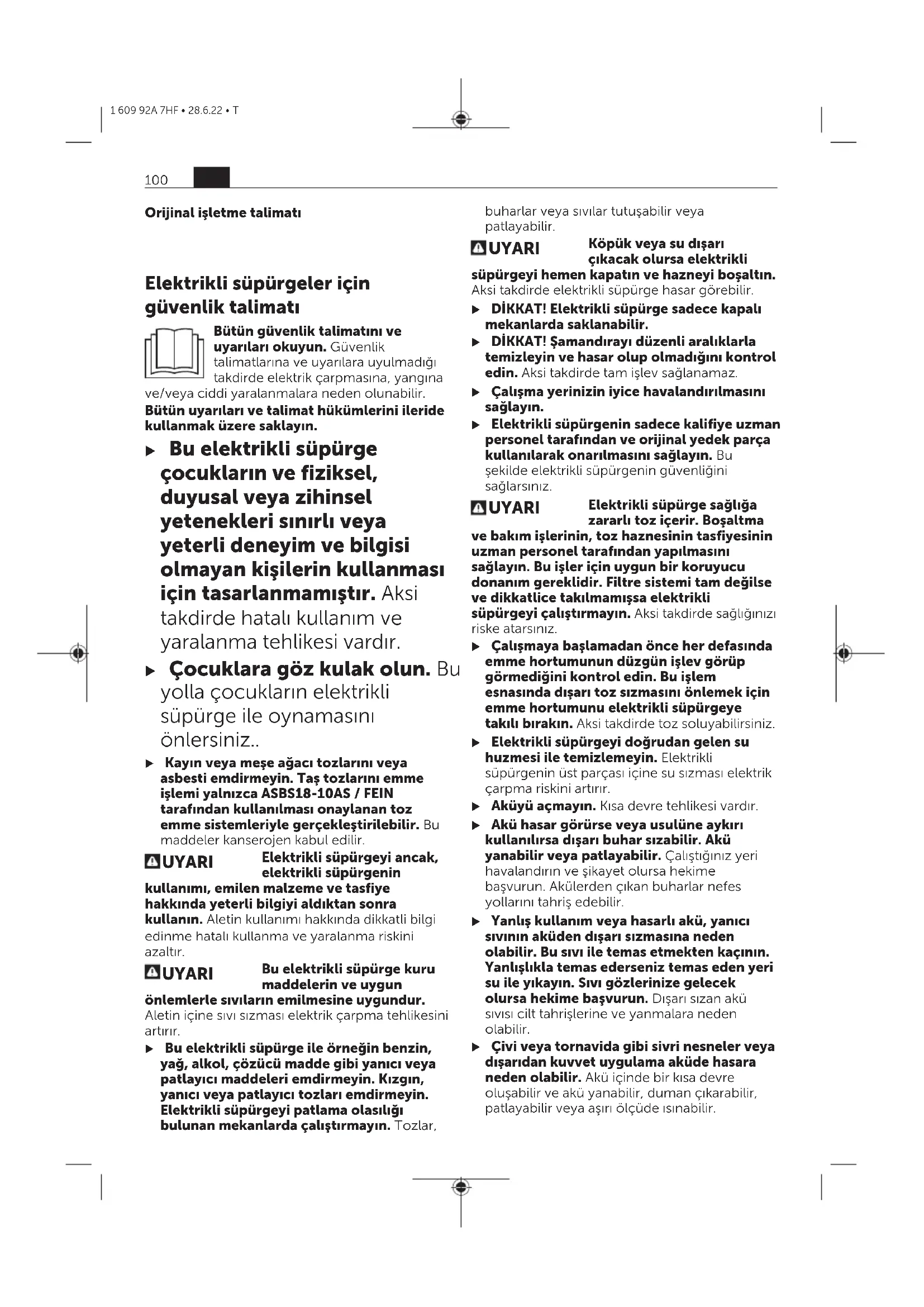 MontajTürkçe u Bakım ve temizlik çalışmalarına, alet ayarlarına, aksesuar değiştirmeye başlamadan veya elektrikli süpürgeyi saklamak üzere kaldırmadan önce aküyü çıkarın. Bu önlem elektrikli süpürgenin yanlışlıkla ve istenmeden çalıştırılmasını önler. Akünün şarjıTürkçe u Sadece teknik veriler bölümünde belirtilen şarj cihazlarını kullanın. Sadece bu şarj cihazları elektrikli süpürgenizde kullanılan lityum iyon akülere uygundur. 102 tr 1 609 92A 7HF • 28.6.22 • TNot: Lityum İyon aküler, uluslararası nakliye kurallarına uygun olarak kısmi şarjlı olarak teslim edilmektedir. Aküden tam performansı elde edebilmek için ilk kullanımdan önce aküyü tam olarak şarj edin. u Elektrikli süpürge otomatik olarak kapandıktan sonra açma/kapama tuşuna basmaya devam etmeyin. Aksi takdirde akü hasar görebilir. Şarj işleminden sonra çok kısa süre çalışılabiliyorsa akü ömrünü tamamlamış ve değiştirilmesi gerekiyor demektir. İmha konusundaki talimatlara uyun. Akü şarj durumu göstergesiTürkçe Akü takıldığında, elektrikli süpürgenin akü şarj durumu göstergesinde(4), akü çıkarıldığı zaman ise akünün üzerinde görebilirsiniz. Elektrikli süpürgedeki akü şarj durumu göstergesiTürkçe Elektrikli süpürge açıldıktan sonra akü şarj durumu göstergesinin(4) 5 yeşil LED'i teker teker ve artacak şekilde yanar. Daha sonra LED'ler akünün(19) şarj durumunu gösterir. Aküdeki akü şarj durumu göstergesiTürkçe Akü elektrikli süpürgeden çıkarıldığında şarj durumu akünün şarj durumu göstergesinin yeşil LED'leriyle gösterilir. Şarj durumunu görmek için şarj durumu göstergesi tuşları ya da üzerine basın. Şarj durumu göstergesi tuşuna basıldıktan sonra hiçbir LED yanmazsa, akü arızalı demektir ve değiştirilmesi gerekir. Akü tipi GBA 18V...Türkçe LED'ler Kapasite Sürekli ışık 3× yeşil %60−100 Sürekli ışık 2× yeşil %30−60 Sürekli ışık 1× yeşil %5−30 Yanıp sönen ışık 1× yeşil %0−5 Akü tipi ProCORE18V...Türkçe LED'ler Kapasite Sürekli ışık 5× yeşil %80−100 Sürekli ışık 4× yeşil %60−80 Sürekli ışık 3× yeşil %40−60 Sürekli ışık 2× yeşil %20−40 Sürekli ışık 1× yeşil %5−20 Yanıp sönen ışık 1× yeşil %0−5 Akünün takılması ve çıkarılması (Bakınız:ResimlerA1−A2)Türkçe u Aküyü takarken zor kullanmayın. Akü, sadece doğru pozisyonda ürüne takılabilecek biçimde tasarlanmıştır. u Verimli ve güvenli biçimde çalışabilmek için akü gözünü ve akü yuvasını her zaman tezim ve kuru tutun. – Boşa alma tuşuna (10) basarak akü haznesi kapağını (11) açın. – işitilir biçimde kilitleme yapıncaya kadar aküyü (19) akü yuvasına (18) itin. – Aküyü (19) çıkarmak için aküdeki boşa alma tuşuna (20) basın ve aküyü akü yuvasından (18) çekerek çıkarın. – Akü haznesi kapağını (11) kapatın. Emme aksesuarı mesnetlerinin takılması (Bakınız:ResimB)Türkçe – Emme borusu ve derz ucu mesnedini (21) yukarıdan kendisi için öngörülen yuvaya (9) kilitleme yapıncaya kadar itin. – Emme hortumu ve taban memesi mesnedini (23) yukarıdan kendisi için öngörülen yuvaya (7) itin ve sabitleme vidasını (22) sıkın. Emme hortumunun takılması (Bakınız: Resim C)Türkçe – Emme hortumunu (12) hortum yuvasına (8), emme hortumunun her iki basmalı düğmesi (24) kavrama yapacak biçimde takın. Not: Emme işlemi esnasında emme hortumu ve aksesuar içindeki tozun sürtünmesi nedeniyle elektro statik yüklenme olur ve bunu kullanıcı statik deşarj olarak algılayabilir (çevre koşullarına ve bedensel hassasiyete bağlı olarak). Emme aksesuarının takılmasıTürkçe Emme hortumu (12) bir klips sistemi ile donatılmış olup, bununla emme aksesuarı (emme adaptörü (13), kavisli meme (uç) (14)) bağlanabilir. Emme adaptörü veya kavisli memenin takılması (Bakınız:ResimD)Türkçe – Emme adaptörünü (13) veya kavisli memeyi (14) emme hortumuna (12) emme hortumunun her iki basmalı düğmesi (24) işitilir biçimde kavrama yapıncaya kadar takın. – Sökmek için basmalı düğmeleri (24) içe doğru bastırın ve parçayı sökün. Memelerin ve boruların takılmasıTürkçe – Gerektiğinde emme borularını (17) sıkıca birbirine ve sonra sıkıca kavisli memeye (14) takın. – Zemin memesini (16) veya derz memesini (15) sıkıca emme borusuna (17) veya kavisli (açılı) memeye (14) takın. tr 103 1 609 92A 7HF • 28.6.22 • TKayış kasnağının monte edilmesi (bkz.ResimE)Türkçe 4 adet kayış kasnağı(25) sabitleme pimini, kayış kasnağı yuvalarında(26) sesli bir şekilde yerine oturana kadar itin. EN12529 (sabitleme pimi çapı 11mm) normuna göre diğer kayış kasnakları da kullanılabilir. u Elektrikli süpürgeyi kullanmadan önce teker frenlerini işlevsellik bakımından kontrol edin. İşletimTürkçe u Bakım ve temizlik çalışmalarına, alet ayarlarına, aksesuar değiştirmeye başlamadan veya elektrikli süpürgeyi saklamak üzere kaldırmadan önce aküyü çıkarın. Bu önlem elektrikli süpürgenin yanlışlıkla ve istenmeden çalıştırılmasını önler. u Takılıp tökezleme tehlikesi nedeniyle çalışma alanınızı temiz ve düzenli tutun. ÇalıştırmaTürkçe u Elektrikli süpürge filtresiz kullanılmamalıdır. u Sadece hasarsız filtre kullanın (filtrede çatlak, delik ve benzerleri olmamalıdır). Hasarlı filtreyi hemen değiştirin. u Emdirme işlemine başlamadan önce filtre ünitesinin sıkıca takılı olduğundan emin olun. u Emdirme işlemine başlamadan önce akü gözü kapağının güvenli biçimde kapatılmış olduğundan emin olun. u Lütfen ülkenizde geçerli olan sağlığa zararlı tozlarla çalışmaya yönelik düzenlemeler/ yasal mevzuat hakkında bilgi alın. Bu elektrik süpürgesi prensip olarak patlama riski bulunan mekanlarda k