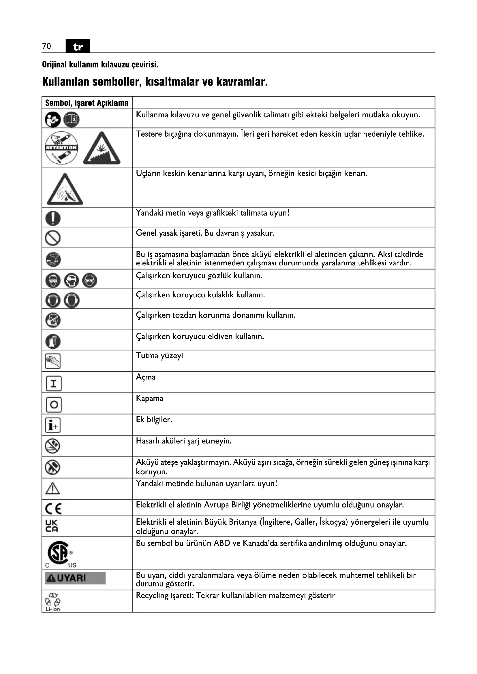 Orijinal kullanım kılavuzu çevirisi. Kullanılan semboller, kısaltmalar ve kavramlar. Sembol, işaret Açıklama Kullanma kılavuzu ve genel güvenlik talimatı gibi ekteki belgeleri mutlaka okuyun. Testere bıçağına dokunmayın. İleri geri hareket eden keskin uçlar nedeniyle tehlike. Uçların keskin kenarlarına karşı uyarı, örneğin kesici bıçağın kenarı. Yandaki metin veya grafikteki talimata uyun! Genel yasak işareti. Bu davranış yasaktır. Bu iş aşamasına başlamadan önce aküyü elektrikli el aletinden çakarın. Aksi takdirde elektrikli el aletinin istenmeden çalışması durumunda yaralanma tehlikesi vardır. Çalışırken koruyucu gözlük kullanın. Çalışırken koruyucu kulaklık kullanın. Çalışırken tozdan korunma donanımı kullanın. Çalışırken koruyucu eldiven kullanın. Tutma yüzeyi Açma Kapama Ek bilgiler. Hasarlı aküleri şarj etmeyin. Aküyü ateşe yaklaştırmayın. Aküyü aşırı sıcağa, örneğin sürekli gelen güneş ışınına karşı koruyun. Yandaki metinde bulunan uyarılara uyun! Elektrikli el aletinin Avrupa Birliği yönetmeliklerine uyumlu olduğunu onaylar. Elektrikli el aletinin Büyük Britanya (İngiltere, Galler, İskoçya) yönergeleri ile uyumlu olduğunu onaylar. Bu sembol bu ürünün ABD ve Kanada’da sertifikalandırılmış olduğunu onaylar. Bu uyarı, ciddi yaralanmalara veya ölüme neden olabilecek muhtemel tehlikeli bir durumu gösterir. Recycling işareti: Tekrar kullanılabilen malzemeyi gösterir71