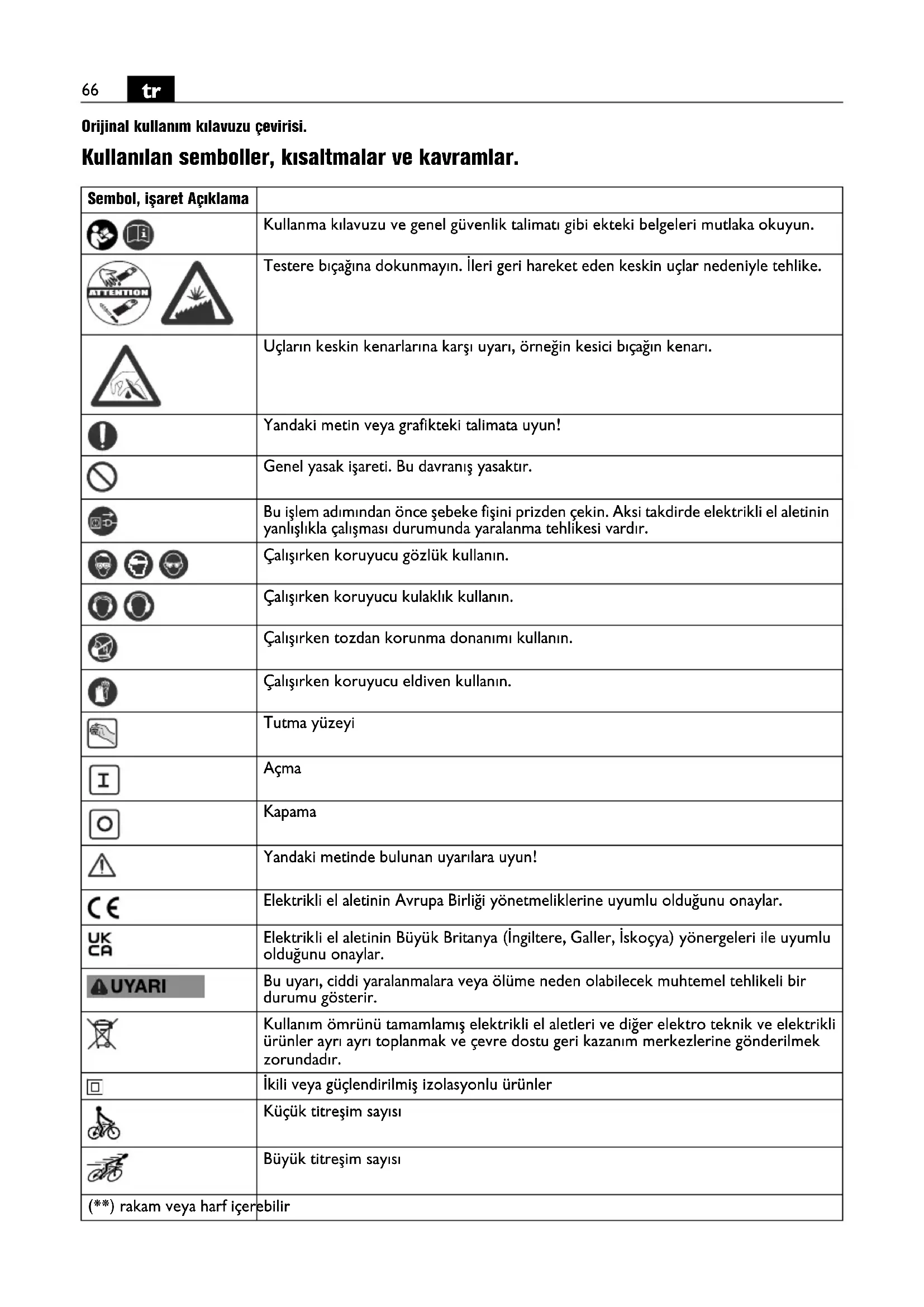 Orijinal kullanım kılavuzu çevirisi. Kullanılan semboller, kısaltmalar ve kavramlar. Sembol, işaret Açıklama Kullanma kılavuzu ve genel güvenlik talimatı gibi ekteki belgeleri mutlaka okuyun. Testere bıçağına dokunmayın. İleri geri hareket eden keskin uçlar nedeniyle tehlike. Uçların keskin kenarlarına karşı uyarı, örneğin kesici bıçağın kenarı. Yandaki metin veya grafikteki talimata uyun! Genel yasak işareti. Bu davranış yasaktır. Bu işlem adımından önce şebeke fişini prizden çekin. Aksi takdirde elektrikli el aletinin yanlışlıkla çalışması durumunda yaralanma tehlikesi vardır. Çalışırken koruyucu gözlük kullanın. Çalışırken koruyucu kulaklık kullanın. Çalışırken tozdan korunma donanımı kullanın. Çalışırken koruyucu eldiven kullanın. Tutma yüzeyi Açma Kapama Yandaki metinde bulunan uyarılara uyun! Elektrikli el aletinin Avrupa Birliği yönetmeliklerine uyumlu olduğunu onaylar. Elektrikli el aletinin Büyük Britanya (İngiltere, Galler, İskoçya) yönergeleri ile uyumlu olduğunu onaylar. Bu uyarı, ciddi yaralanmalara veya ölüme neden olabilecek muhtemel tehlikeli bir durumu gösterir. Kullanım ömrünü tamamlamış elektrikli el aletleri ve diğer elektro teknik ve elektrikli ürünler ayrı ayrı toplanmak ve çevre dostu geri kazanım merkezlerine gönderilmek zorundadır. İkili veya güçlendirilmiş izolasyonlu ürünler Küçük titreşim sayısı Büyük titreşim sayısı (**) rakam veya harf içerebilir67