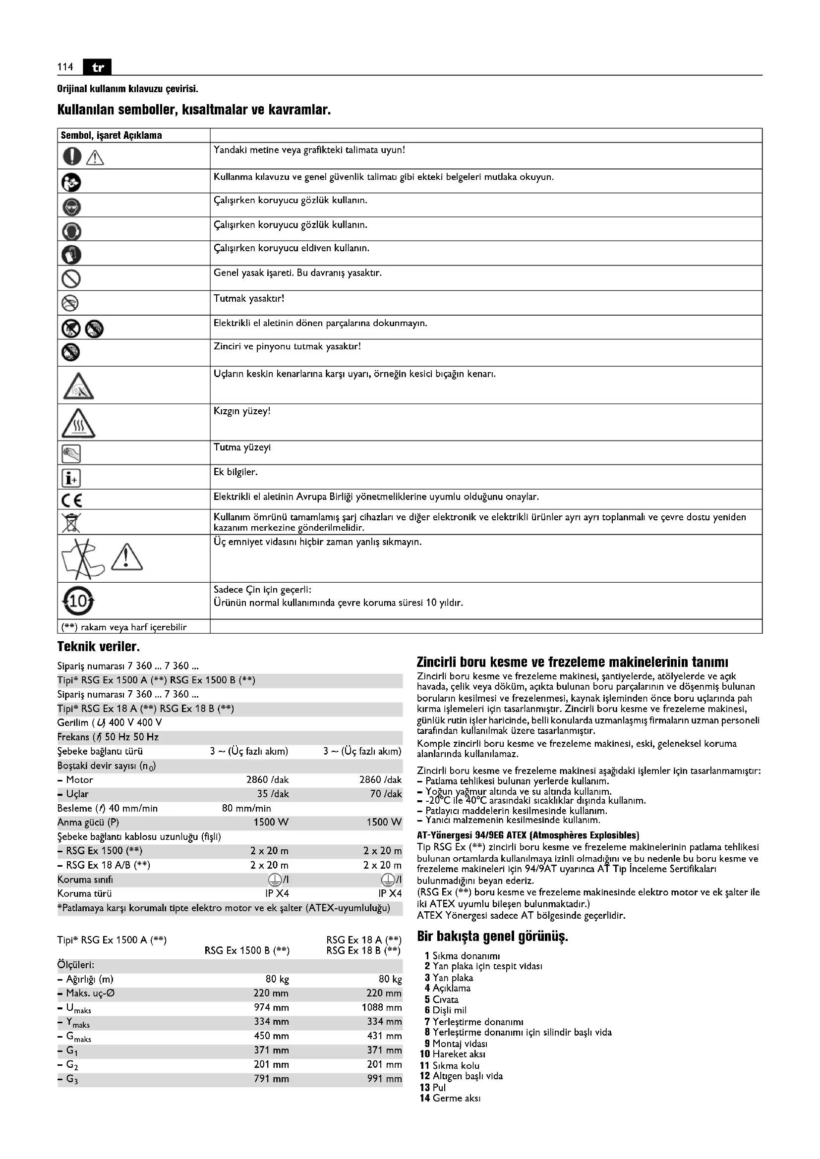 Tip RSG Ex (^**) zinciri boru kesme ve frezeleme makinerin patlama tehlikesi bulunan ortamarda kullanilmaya izinl olmadigi ne bu nedenle bu boru kesme ve frezeleme makineri ig 94/9AT uyarinca AT Tip Inceleme Sertifikalari bulunmadigi bian ederiz.