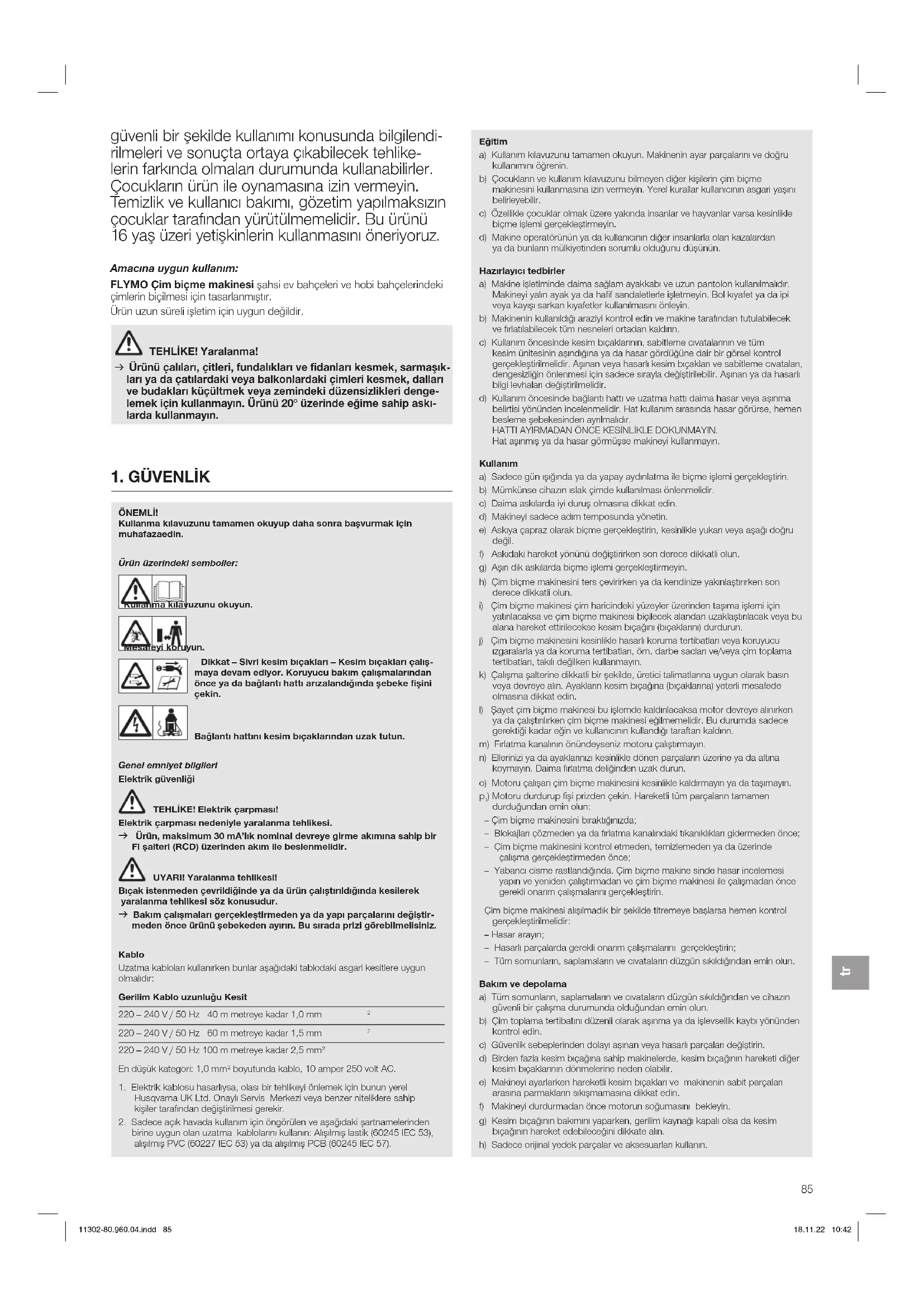 Eğitim a) Kullanım kılavuzunu tamamen okuyun. Makinenin ayar parçalarını ve doğru kullanımını öğrenin. b) Çocukların ve kullanım kılavuzunu bilmeyen diğer kişilerin çim biçme makinesini kullanmasına izin vermeyin. Yerel kurallar kullanıcının asgari yaşını belirleyebilir. c) Özellikle çocuklar olmak üzere yakında insanlar ve hayvanlar varsa kesinlikle biçme işlemi gerçekleştirmeyin. d) Makine operatörünün ya da kullanıcının diğer insanlarla olan kazalardan ya da bunların mülkiyetinden sorumlu olduğunu düşünün. Hazırlayıcı tedbirler a) Makine işletiminde daima sağlam ayakkabı ve uzun pantolon kullanılmalıdır. Makineyi yalın ayak ya da hafif sandaletlerle işletmeyin. Bol kıyafet ya da ipi veya kayışı sarkan kıyafetler kullanılmasını önleyin. b) Makinenin kullanıldığı araziyi kontrol edin ve makine tarafından tutulabilecek ve fırlatılabilecek tüm nesneleri ortadan kaldırın. c) Kullanım öncesinde kesim bıçaklarının, sabitleme cıvatalarının ve tüm kesim ünitesinin aşındığına ya da hasar gördüğüne dair bir görsel kontrol gerçekleştirilmelidir. Aşınan veya hasarlı kesim bıçakları ve sabitleme cıvataları, dengesizliğin önlenmesi için sadece sırayla değiştirilebilir. Aşınan ya da hasarlı bilgi levhaları değiştirilmelidir. d) Kullanım öncesinde bağlantı hattı ve uzatma hattı daima hasar veya aşınma belirtisi yönünden incelenmelidir. Hat kullanım sırasında hasar görürse, hemen besleme şebekesinden ayrılmalıdır. HATTI AYIRMADAN ÖNCE KESİNLİKLE DOKUNMAYIN. Hat aşınmış ya da hasar görmüşse makineyi kullanmayın. Kullanım a) Sadece gün ışığında ya da yapay aydınlatma ile biçme işlemi gerçekleştirin. b) Mümkünse cihazın ıslak çimde kullanılması önlenmelidir. c) Daima askılarda iyi duruş olmasına dikkat edin. d) Makineyi sadece adım temposunda yönetin. e) Askıya çapraz olarak biçme gerçekleştirin, kesinlikle yukarı veya aşağı doğru değil. f) Askıdaki hareket yönünü değiştirirken son derece dikkatli olun. g) Aşırı dik askılarda biçme işlemi gerçekleştirmeyin. h) Çim biçme makinesini ters çevirirken ya da kendinize yakınlaştırırken son derece dikkatli olun.