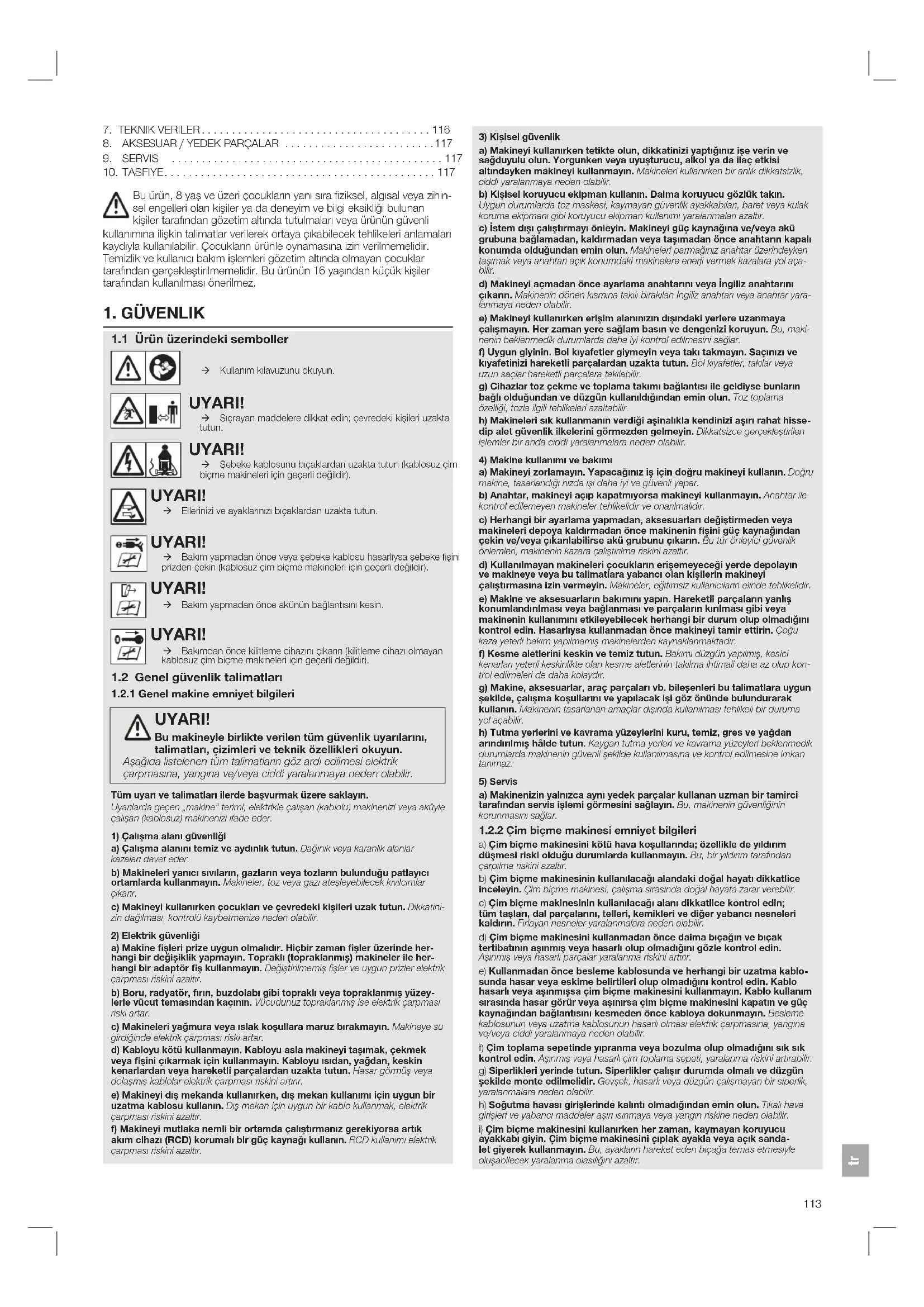 Bu makineyle birlikte verilen tum guvenlik uyarlarimi, talimatlari, cizimleri ve teknik ozellikleri okuyun.
