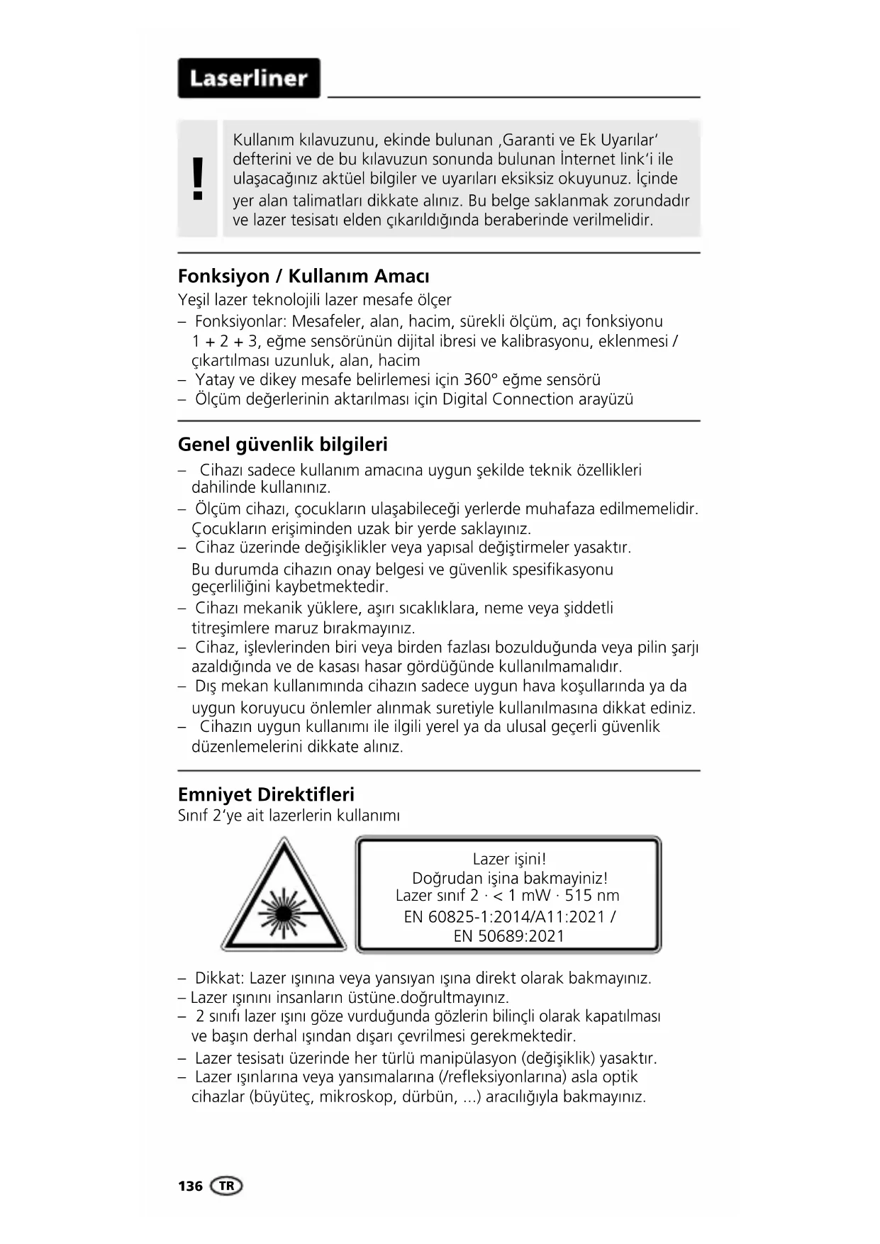 EU- og UK-bestemmelser og avfallshåndtering Instrumentet oppfyller alle relevante normer for fri varehandel innenfor EU og UK. Dette produktet, inkludert tilbehør og emballasje, er et elektrisk apparat som i henhold til europeiske og britiske direktiver om avfall fra elektrisk og elektronisk utstyr, batterier og emballasje, må resirkuleres på en miljømessig forsvarlig måte for å gjenvinne verdifulle råvarer. Elektriske apparater, batterier og emballasje skal ikke kastes i husholdningsavfallet. Forbrukere er lovpålagt å levere inn brukte batterier og akkumulatorer gratis på et offentlig innsamlingssted, på et salgssted eller til teknisk kundeservice. Batteriet skal tas ut av apparatet med verktøy som er vanlig i handelen uten at det ødelegges og tilføres et kildesorteringsanlegg, før du returnerer apparatet til avfallshåndtering. Ved spørsmål om å ta ut batteriet, kan serviceavdelingen til UMAREX-LASERLINER kontaktes. Ta kontakt med din kommune for å få informasjon om egnede avfallshåndteringssteder og følg de respektive avfallshåndterings- og sikkerhetsinstruksene på innsamlingsstedene. Ytterligere sikkerhetsinstrukser og tilleggsinformasjon på: http://laserliner.com/info?an=AHE136 Genel güvenlik bilgileri – Cihazı sadece kullanım amacına uygun şekilde teknik özellikleri dahilinde kullanınız. – Ölçüm cihazı, çocukların ulaşabileceği yerlerde muhafaza edilmemelidir. Çocukların erişiminden uzak bir yerde saklayınız. – Cihaz üzerinde değişiklikler veya yapısal değiştirmeler yasaktır. Bu durumda cihazın onay belgesi ve güvenlik spesikasyonu geçerliliğini kaybetmektedir. – Cihazı mekanik yüklere, aşırı sıcaklıklara, neme veya şiddetli titreşimlere maruz bırakmayınız. – Cihaz, işlevlerinden biri veya birden fazlası bozulduğunda veya pilin şarjı azaldığında ve de kasası hasar gördüğünde kullanılmamalıdır. – Dış mekan kullanımında cihazın sadece uygun hava koşullarında ya da uygun koruyucu önlemler alınmak suretiyle kullanılmasına dikkat ediniz. – Cihazın uygun kullanımı ile ilgili yerel ya da ulusal geçerli güvenlik düzenlemelerini dikkate alınız. Emniyet Direktieri Sınıf 2‘ye ait lazerlerin kullanımı Lazer işini! Doğrudan işina bakmayiniz! Lazer sınıf 2 · < 1 mW · 515 nm EN 60825-1:2014/A11:2021 / EN 50689:2021 Yeşil lazer teknolojili lazer mesafe ölçer – Fonksiyonlar: Mesafeler, alan, hacim, sürekli ölçüm, açı fonksiyonu 1 + 2 + 3, eğme sensörünün dijital ibresi ve kalibrasyonu, eklenmesi / çıkartılması uzunluk, alan, hacim – Yatay ve dikey mesafe belirlemesi için 360° eğme sensörü – Ölçüm değerlerinin aktarılması için Digital Connection arayüzü Fonksiyon / Kullanım Amacı Kullanım kılavuzunu, ekinde bulunan ‚Garanti ve Ek Uyarılar‘ defterini ve de bu kılavuzun sonunda bulunan İnternet link‘i ile ulaşacağınız aktüel bilgiler ve uyarıları eksiksiz okuyunuz. İçinde yer alan talimatları dikkate alınız. Bu belge saklanmak zorundadır ve lazer tesisatı elden çıkarıldığında beraberinde verilmelidir.
