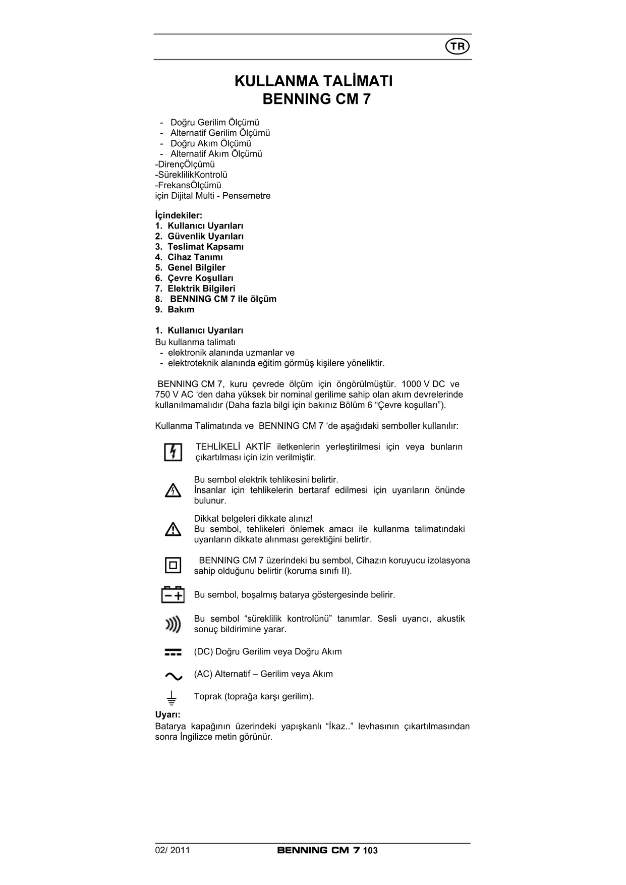 Aşınan parçalar için uyarı: - BENNING CM 7, bir adet 9 V blok batarya (IEC 6 LR 61) tarafından beslenir. - Yukarıda belirtilmiş olan emniyet ölçüm tesisatları (kontrol edilmiş teçhizat), CAT III 1000 V ‘a uygundur ve 10 A akım için izin verilmiştir.