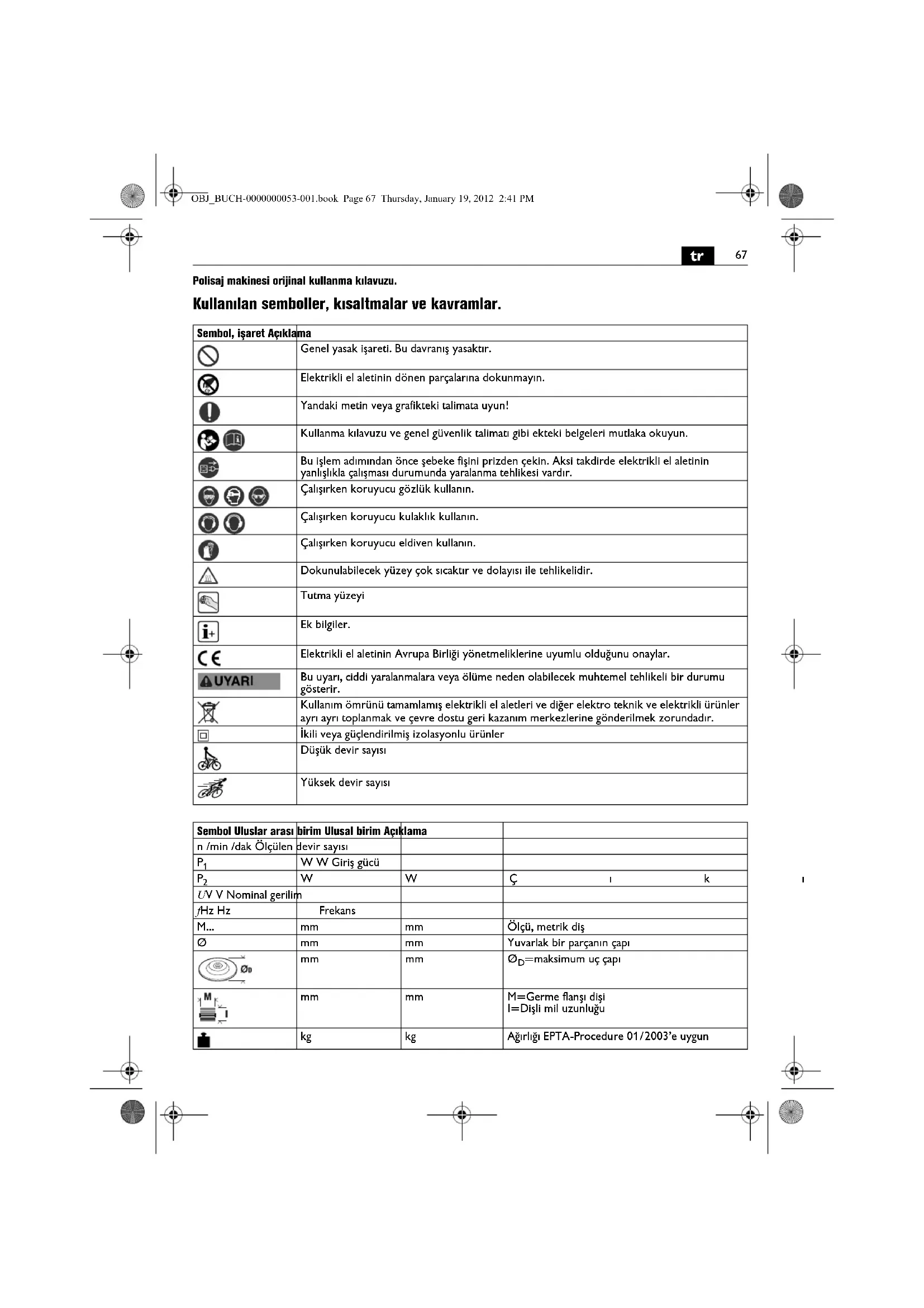 | m, s, kg, A, mm, V, W, Hz, N, °C, dB, min, m/s2 | m, s, kg, A, mm, V, W, Hz, N, °C, dB, dak, m/s2 | Temel ve:türetilen değerler üluslar arasi birirler sistemi Şi'den alinmiştr. | |