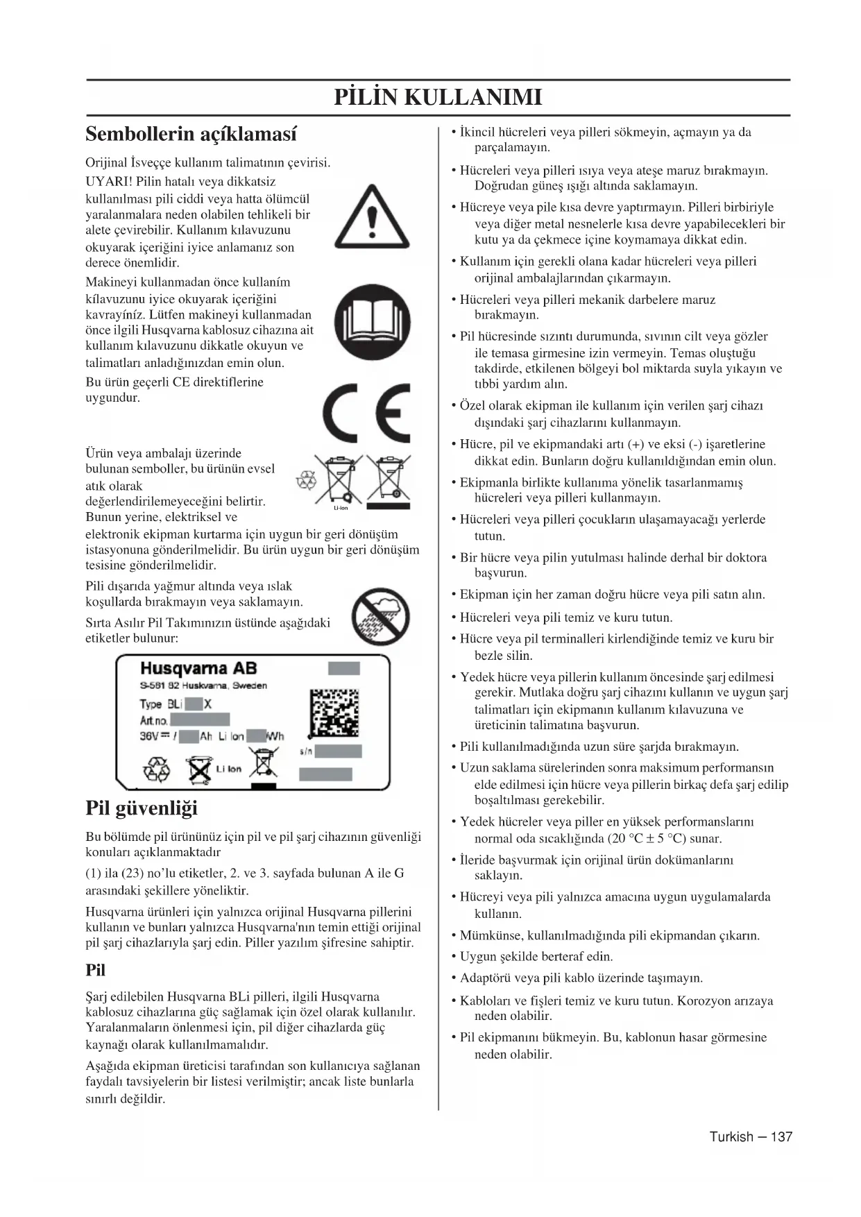 Turkish – 137 Sembollerin açíklamasí Orijinal ‹sveççe kullanım talimatının çevirisi. UYARI! Pilin hatalı veya dikkatsiz kullanılması pili ciddi veya hatta ölümcül yaralanmalara neden olabilen tehlikeli bir alete çevirebilir. Kullanım kılavuzunu okuyarak içeri¤ini iyice anlamanız son derece önemlidir. Makineyi kullanmadan önce kullaním kílavuzunu iyice okuyarak içeri¤ini kavrayíníz. Lütfen makineyi kullanmadan önce ilgili Husqvarna kablosuz cihazına ait kullanım kılavuzunu dikkatle okuyun ve talimatları anladı¤ınızdan emin olun. Bu ürün geçerli CE direktiflerine uygundur. Ürün veya ambalajı üzerinde bulunan semboller, bu ürünün evsel atık olarak de¤erlendirilemeyece¤ini belirtir. Bunun yerine, elektriksel ve elektronik ekipman kurtarma için uygun bir geri dönüflüm istasyonuna gönderilmelidir. Bu ürün uygun bir geri dönüflüm tesisine gönderilmelidir. Pili dıflarıda ya¤mur altında veya ıslak koflullarda bırakmayın veya saklamayın. Sırta Asılır Pil Takımınızın üstünde afla¤ıdaki etiketler bulunur: Pil güvenli¤i Bu bölümde pil ürününüz için pil ve pil flarj cihazının güvenli¤i konuları açıklanmaktadır (1) ila (23) no’lu etiketler, 2. ve 3. sayfada bulunan A ile G arasındaki flekillere yöneliktir. Husqvarna ürünleri için yalnızca orijinal Husqvarna pillerini kullanın ve bunları yalnızca Husqvarna'nın temin etti¤i orijinal pil flarj cihazlarıyla flarj edin. Piller yazılım flifresine sahiptir. Pil fiarj edilebilen Husqvarna BLi pilleri, ilgili Husqvarna kablosuz cihazlarına güç sa¤lamak için özel olarak kullanılır. Yaralanmaların önlenmesi için, pil di¤er cihazlarda güç kayna¤ı olarak kullanılmamalıdır. Afla¤ıda ekipman üreticisi tarafından son kullanıcıya sa¤lanan faydalı tavsiyelerin bir listesi verilmifltir; ancak liste bunlarla sınırlı de¤ildir.