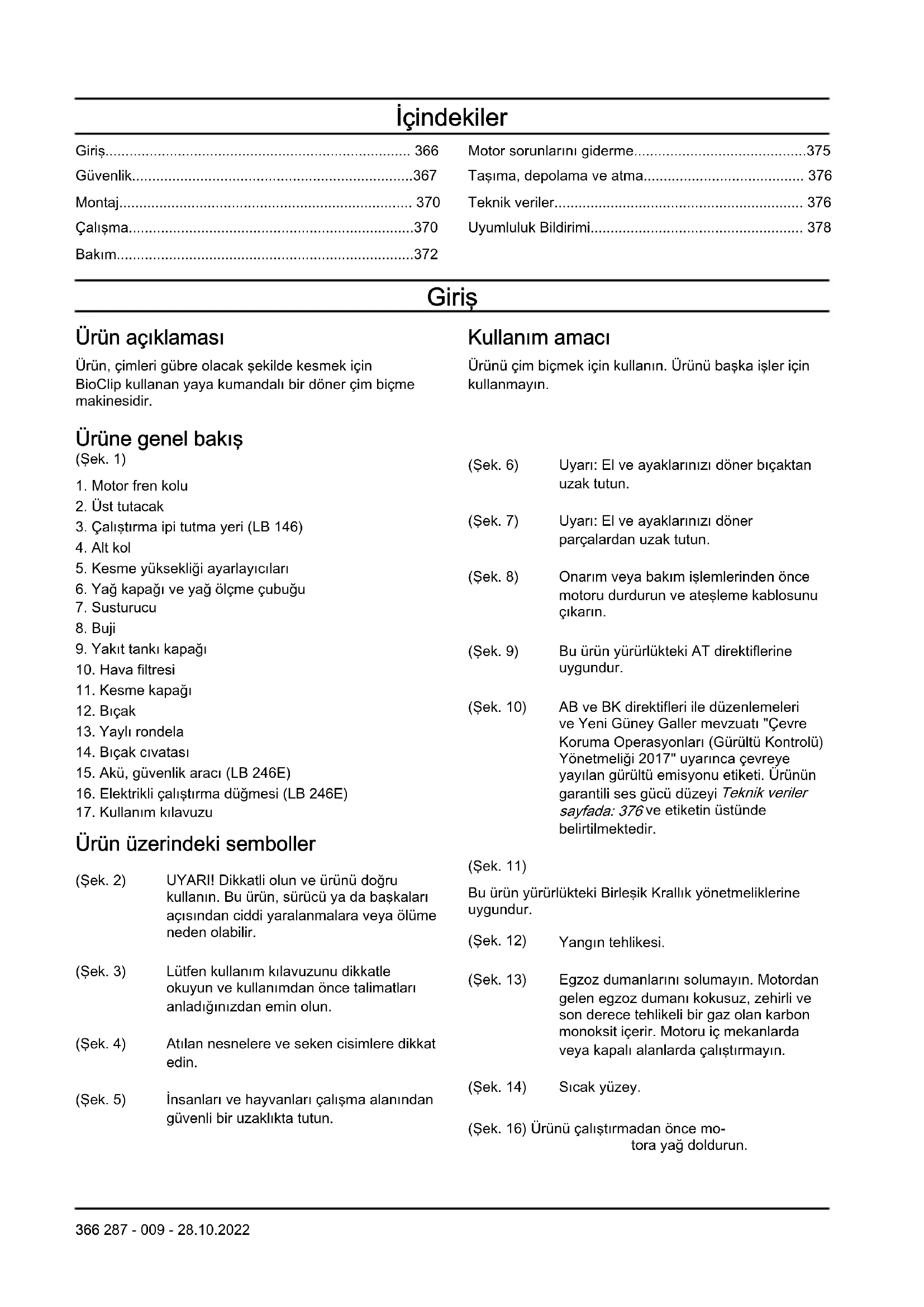 Ürün üzerindeki semboller (Şek. 2) UYARI! Dikkatli olun ve ürünü doğru kullanın. Bu ürün, sürücü ya da başkaları açısından ciddi yaralanmalara veya ölüme neden olabilir. (Şek. 3) Lütfen kullanım kılavuzunu dikkatle okuyun ve kullanımdan önce talimatları anladığınızdan emin olun. (Şek. 4) Atılan nesnelere ve seken cisimlere dikkat edin. (Şek. 5) İnsanları ve hayvanları çalışma alanından güvenli bir uzaklıkta tutun. (Şek. 6) Uyarı: El ve ayaklarınızı döner bıçaktan uzak tutun. (Şek. 7) Uyarı: El ve ayaklarınızı döner parçalardan uzak tutun. (Şek. 8) Onarım veya bakım işlemlerinden önce motoru durdurun ve ateşleme kablosunu çıkarın. (Şek. 9) Bu ürün yürürlükteki AT direktiflerine uygundur. (Şek. 10) AB ve BK direktifleri ile düzenlemeleri ve Yeni Güney Galler mevzuatı "Çevre Koruma Operasyonları (Gürültü Kontrolü) Yönetmeliği 2017" uyarınca çevreye yayılan gürültü emisyonu etiketi. Ürünün garantili ses gücü düzeyi Teknik veriler sayfada: 376 ve etiketin üstünde belirtilmektedir. (Şek. 11) Bu ürün yürürlükteki Birleşik Krallık yönetmeliklerine uygundur. (Şek. 12) Yangın tehlikesi. (Şek. 13) Egzoz dumanlarını solumayın. Motordan gelen egzoz dumanı kokusuz, zehirli ve son derece tehlikeli bir gaz olan karbon monoksit içerir. Motoru iç mekanlarda veya kapalı alanlarda çalıştırmayın. (Şek. 14) Sıcak yüzey. (Şek. 16) Ürünü çalıştırmadan önce mo- tora yağ doldurun. 366 287 - 009 - 28.10.2022(Şek. 17) LB 146 için çalıştırma prose- dürü: Motor fren kolunu aşağı bastırın ve çalıştırma ipi kolu- nu çekin. (Şek. 18) LB 246E için çalıştırma prose- dürü: Motor fren kolunu aşağı bastırın ve çalıştırma düğme- sine basın. (Şek. 15) Taranabilir kod. Not: Ürünün üzerindeki diğer semboller/etiketler, diğer ticari alanların sertifikalandırma gereklilikleri ile ilgilidir. Ürün sorumluluğu Ürün sorumluluğu yasalarında belirtildiği üzere;