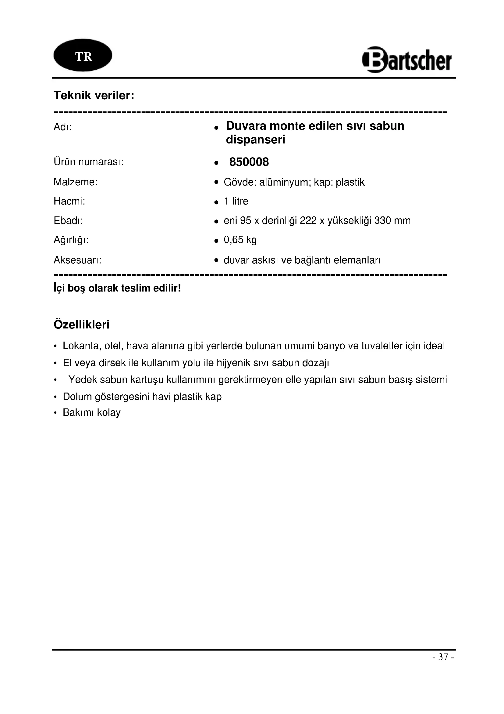 Cihazın kılavuzunu ücretsiz bulun 850008 BARTSCHER PDF formatında.