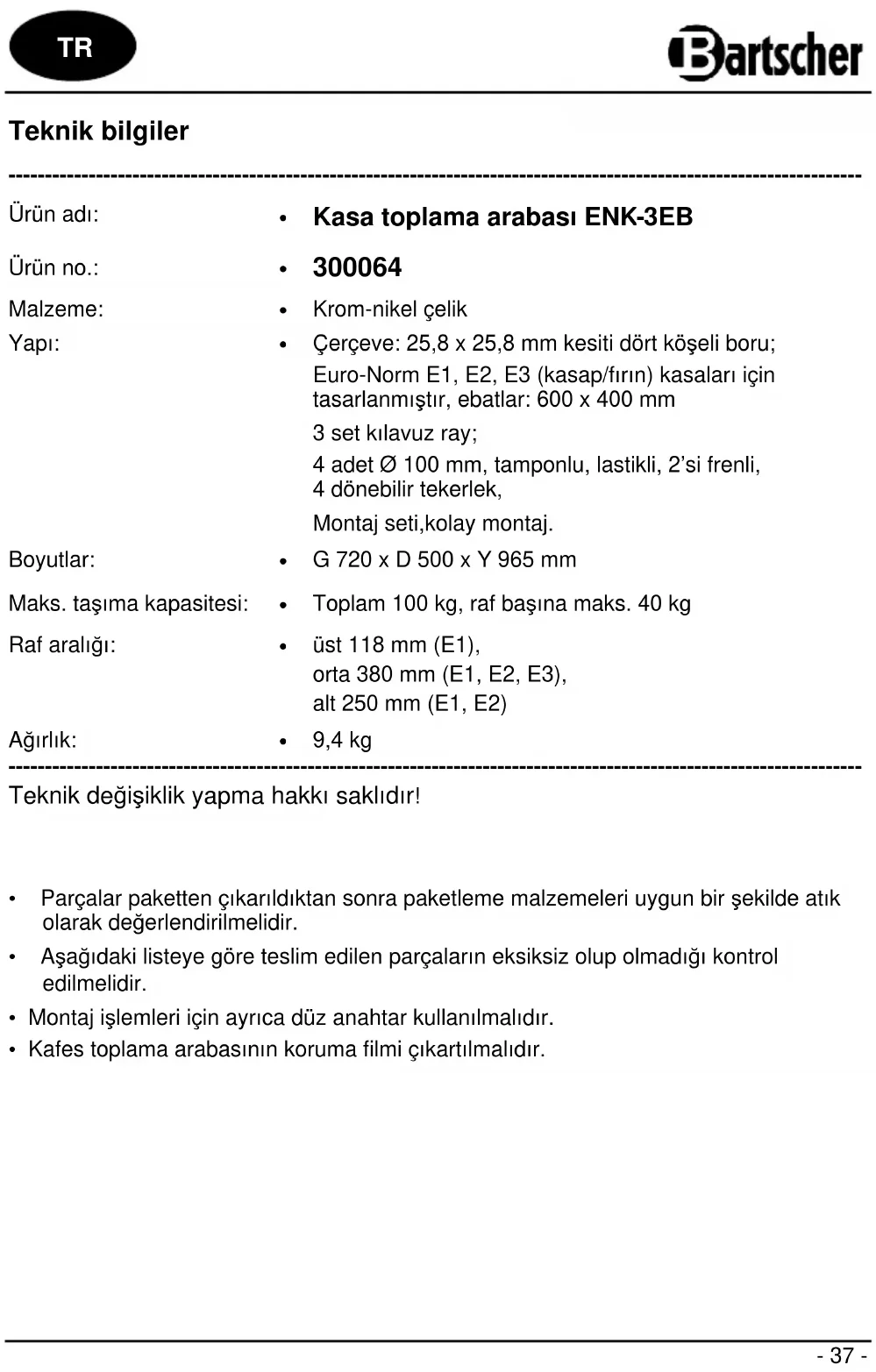 Çerçeve: 25,8 x 25,8 mm kesiti dört köşeli boru; Euro-Norm E1, E2, E3 (kasap/fırın) kasaları için tasarlanmıştır, ebatlar: 600 x 400 mm 3 set kılavuz ray; 4 adet Ø 100 mm, tamponlu, lastikli, 2’si frenli, 4 dönebilir tekerlek, Montaj seti,kolay montaj. Boyutlar: