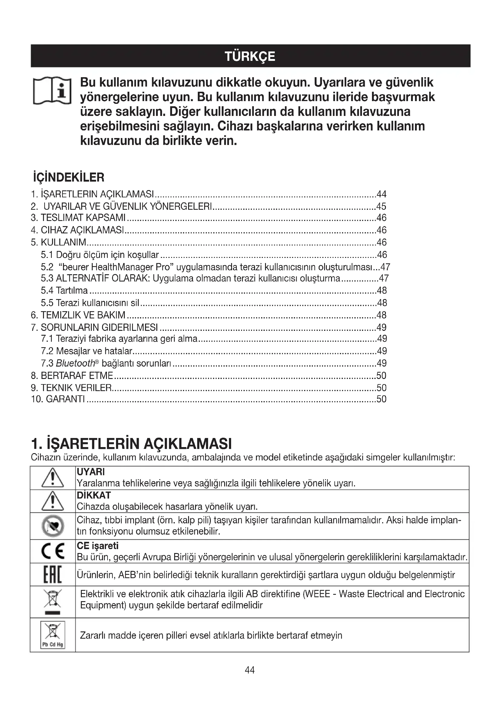 Cihazın üzerinde, kullanım kılavuzunda, ambalajında ve model etiketinde aşağıdaki simgeler kullanılmıştır: UYARI Yaralanma tehlikelerine veya sağlığınızla ilgili tehlikelere yönelik uyarı. DİKKAT Cihazda oluşabilecek hasarlara yönelik uyarı. Cihaz, tıbbi implant (örn. kalp pili) taşıyan kişiler tarafından kullanılmamalıdır. Aksi halde implan- tın fonksiyonu olumsuz etkilenebilir. CE işareti Bu ürün, geçerli Avrupa Birliği yönergelerinin ve ulusal yönergelerin gerekliliklerini karşılamaktadır. Ürünlerin, AEB’nin belirlediği teknik kuralların gerektirdiği şartlara uygun olduğu belgelenmiştir Elektrikli ve elektronik atık cihazlarla ilgili AB direktifine (WEEE - Waste Electrical and Electronic Equipment) uygun şekilde bertaraf edilmelidir Zararlı madde içeren pilleri evsel atıklarla birlikte bertaraf etmeyin45 Birleşik Krallık Değerlendirilmiş Uyumluluk İşareti Üretici Ambalaj bileşenlerini ayırın ve belediyenin kuralla
