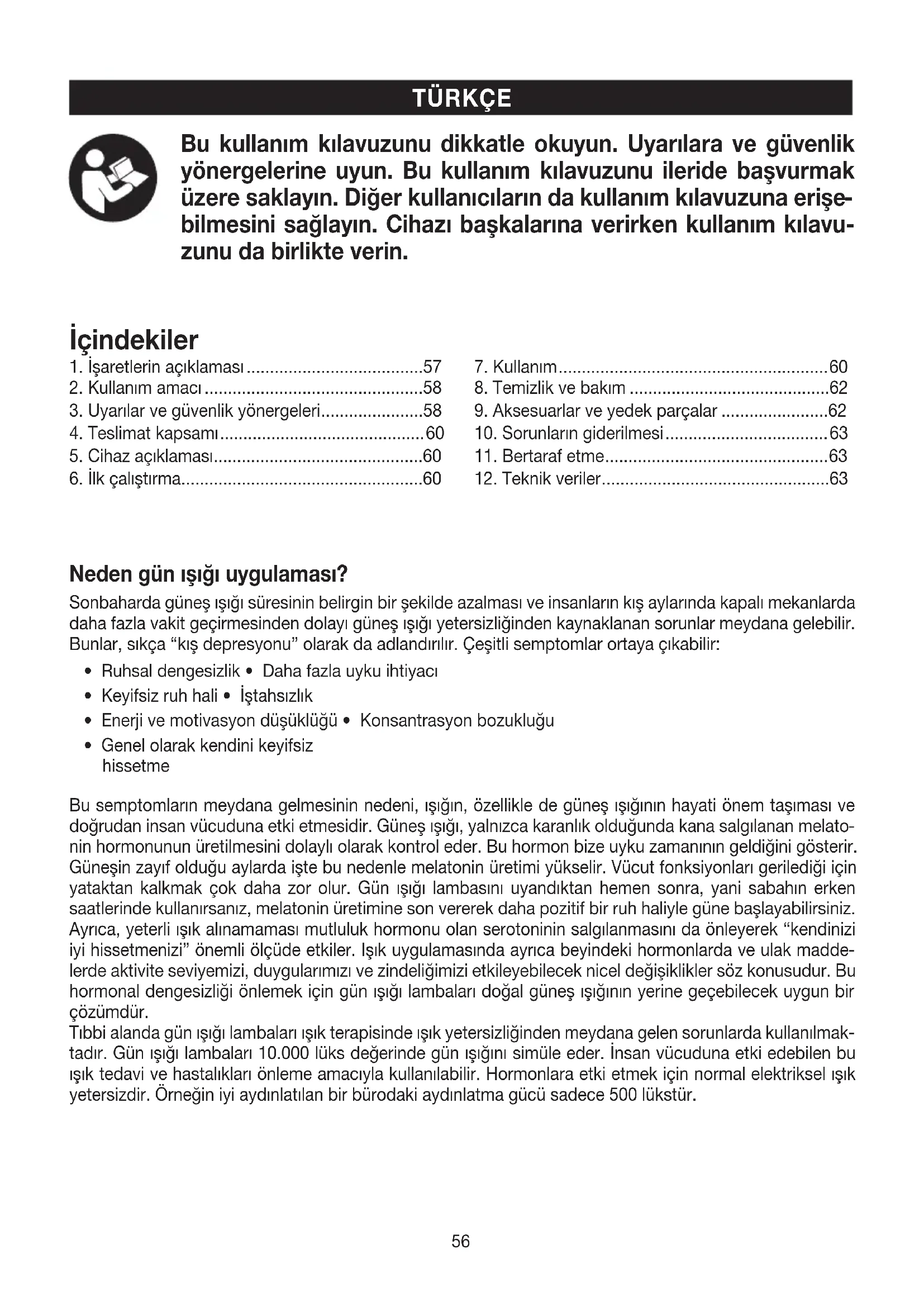 bilmesini sağlayın. Cihazı başkalarına verirken kullanım kılavu- zunu da birlikte verin. Neden gün ışığı uygulaması? Sonbaharda güneş ışığı süresinin belirgin bir şekilde azalması ve insanların kış aylarında kapalı mekanlarda daha fazla vakit geçirmesinden dolayı güneş ışığı yetersizliğinden kaynaklanan sorunlar meydana gelebilir. Bunlar, sıkça “kış depresyonu” olarak da adlandırılır. Çeşitli semptomlar ortaya çıkabilir: