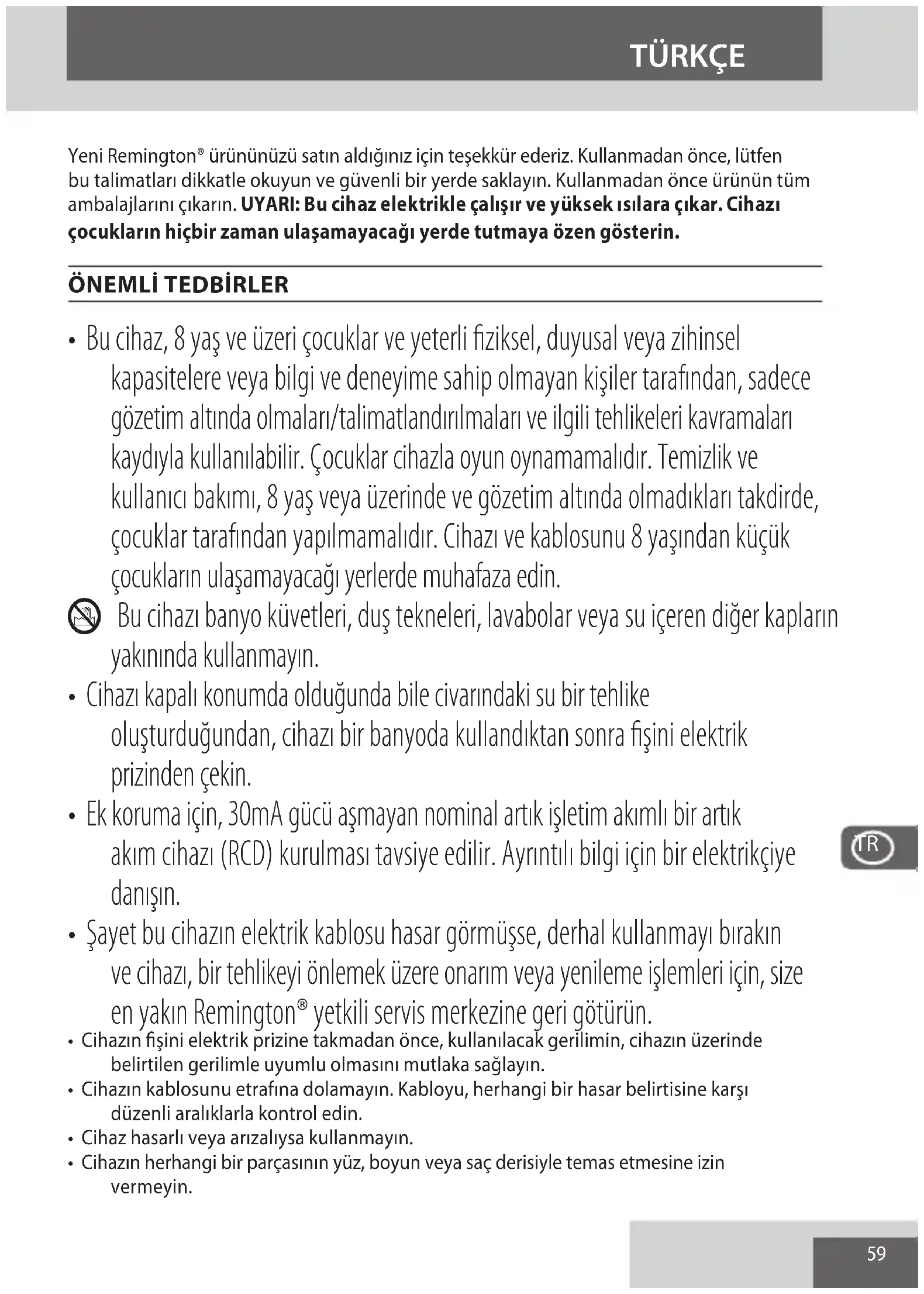 - Şayet bu cihazın elektrik kablosu hasar görmüşse, derhal kullanmayı bırakın ve cihazı, bir tehlikeyi önlemek üzere onarım veya yenileme işlemleri için, size en yakın Remington® yetkili servis merkezine geri götürün.