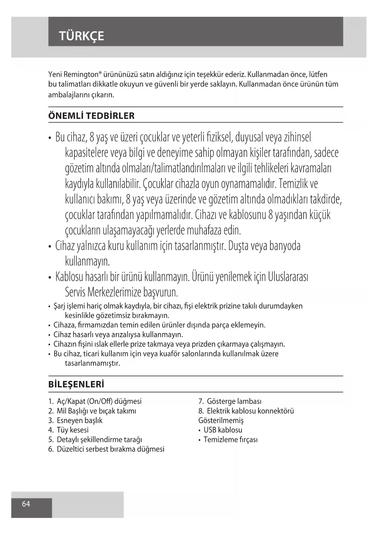 AE64 Yeni Remington® ürününüzü satın aldığınız için teşekkür ederiz. Kullanmadan önce, lütfen bu talimatları dikkatle okuyun ve güvenli bir yerde saklayın. Kullanmadan önce ürünün tüm ambalajlarını çıkarın.