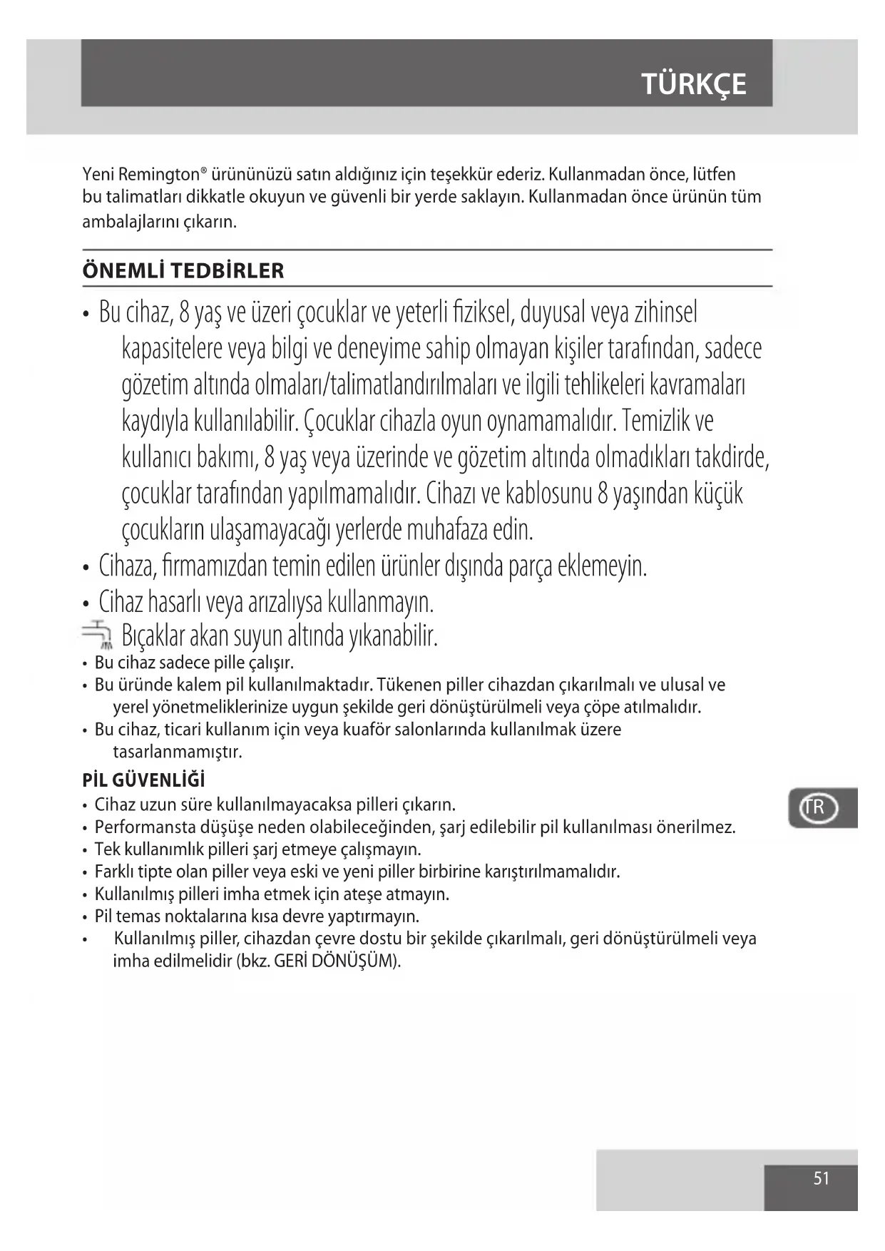 - Bu cihaz sadece pille çalışır.• Bu üründe kalem pil kullanılmaktadır. Tükenen piller cihazdan çıkarılmalı ve ulusal ve yerel yönetmeliklerinize uygun şekilde geri dönüştürülmeli veya çöpe atılmalıdır.• Bu cihaz, ticari kullanım için veya kuaför salonlarında kullanılmak üzere tasarlanmamıştır.PİL GÜVENLİĞİ• Cihaz uzun süre kullanılmayacaksa pilleri çıkarın.• Performansta düşüşe neden olabileceğinden, şarj edilebilir pil kullanılması önerilmez.• Tek kullanımlık pilleri şarj etmeye çalışmayın.• Farklı tipte olan piller veya eski ve yeni piller birbirine karıştırılmamalıdır.• Kullanılmış pilleri imha etmek için ateşe atmayın.• Pil temas noktalarına kısa devre yaptırmayın.