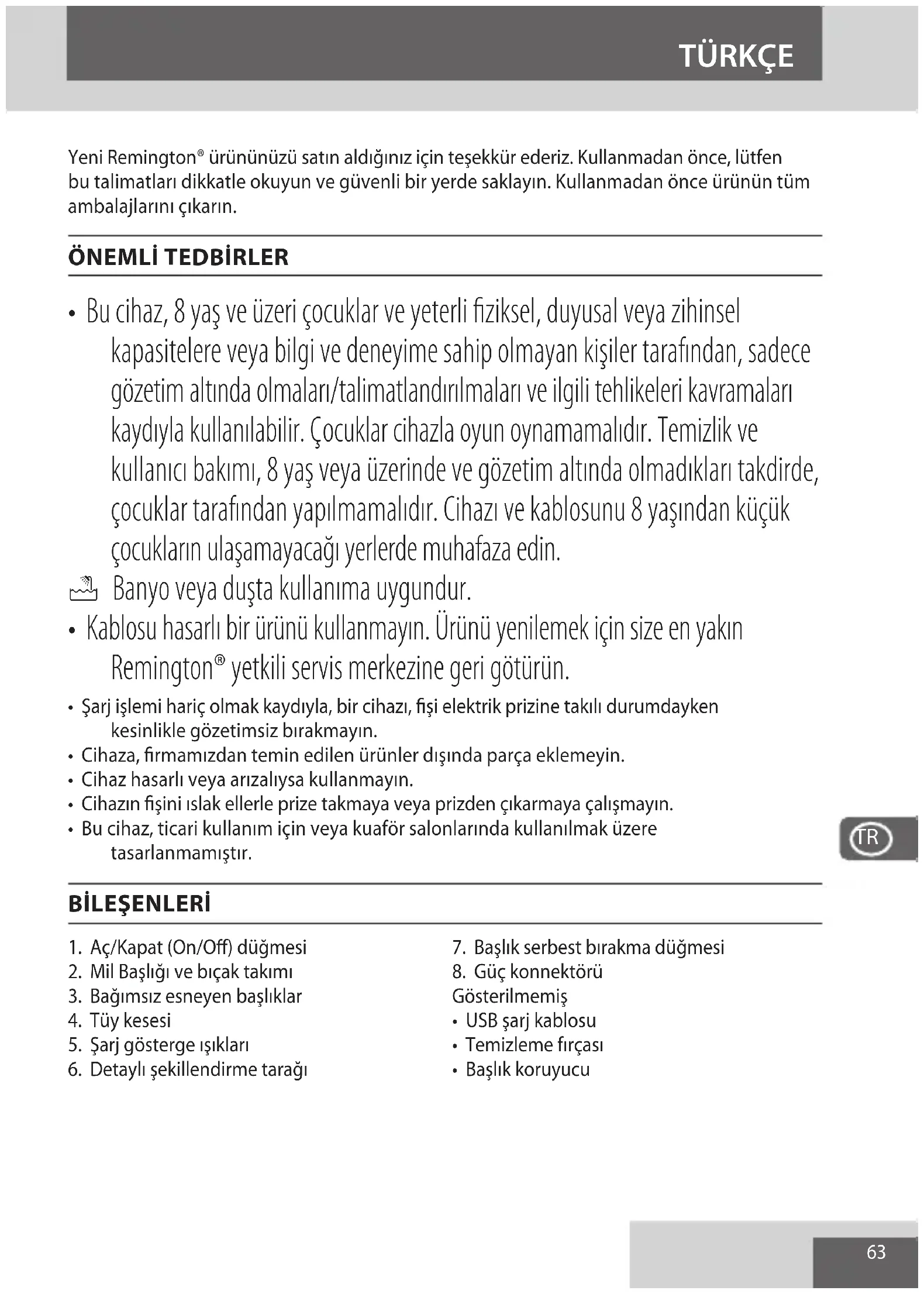 - Kablosu hasarlı bir ürünü kullanmayın. Ürünü yenilemek için size en yakın Remington® yetkili servis merkezine geri götürün.