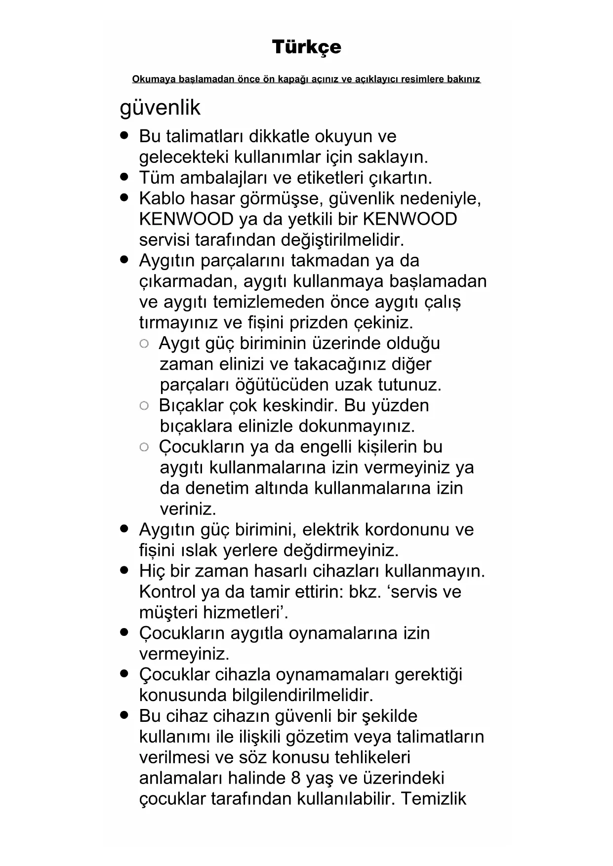 Aygıtın parçalarını takmadan ya da çıkarmadan, aygıtı kullanmaya ba…lamadan ve aygıtı temizlemeden önce aygıtı çalı… tırmayınız ve fi…ini prizden çekiniz. Aygıt güç biriminin üzerinde olduòu zaman elinizi ve takacaòınız diòer parçaları öòütücüden uzak tutunuz. Bıçaklar çok keskindir. Bu yüzden bıçaklara elinizle dokunmayınız. Çocukların ya da engelli ki…ilerin bu aygıtı kullanmalarına izin vermeyiniz ya da denetim altında kullanmalarına izin veriniz.