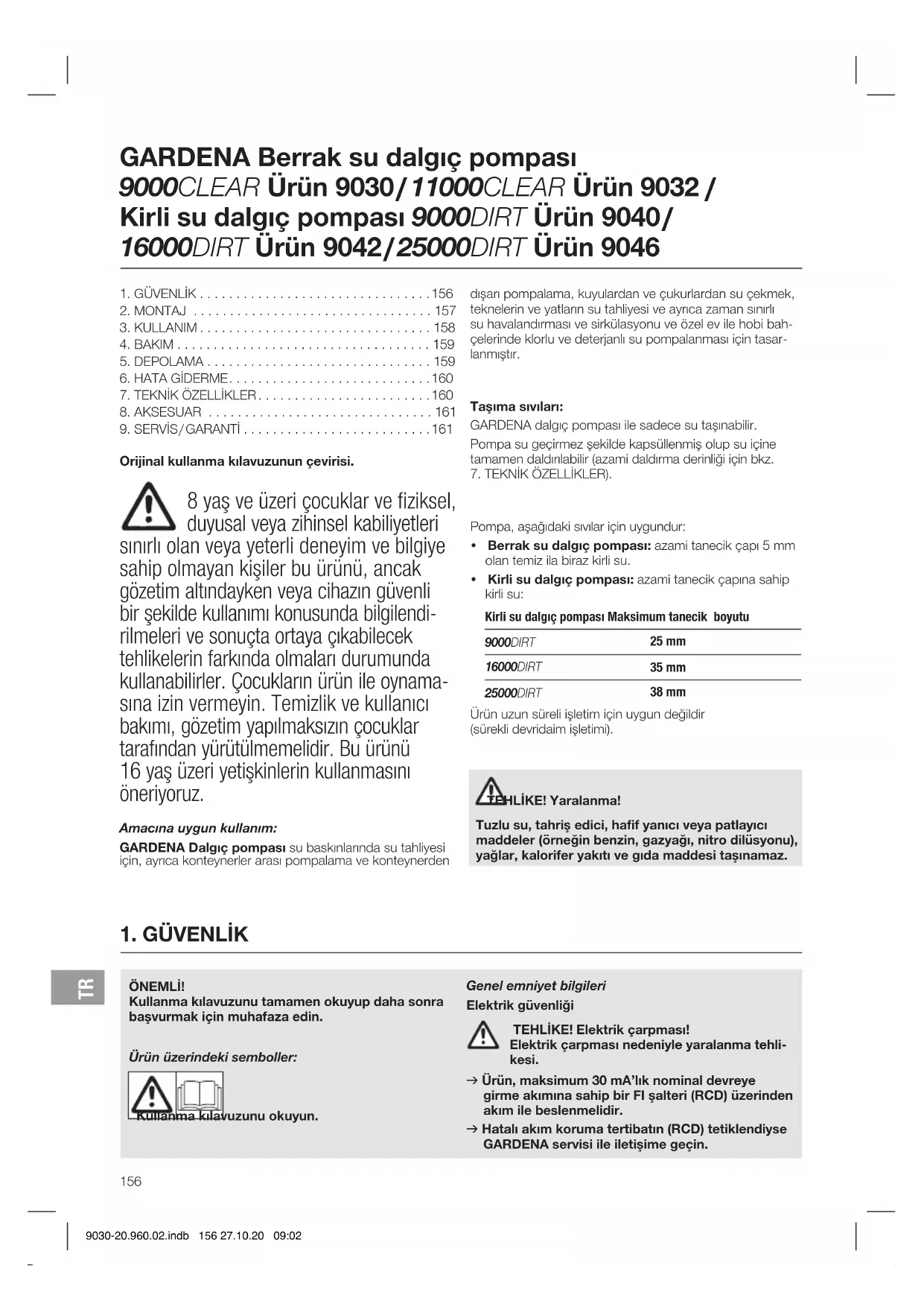 ÖNEMLİ! Kullanma kılavuzunu tamamen okuyup daha sonra başvurmak için muhafaza edin. Ürün üzerindeki semboller: Kullanma kılavuzunu okuyun. Genel emniyet bilgileri Elektrik güvenliği TEHLİKE! Elektrik çarpması! Elektrik çarpması nedeniyle yaralanma tehli- kesi. v Ürün, maksimum 30 mA’lık nominal devreye girme akımına sahip bir FI şalteri (RCD) üzerinden akım ile beslenmelidir. v Hatalı akım koruma tertibatın (RCD) tetiklendiyse GARDENA servisi ile iletişime geçin. GARDENA Berrak su dalgıç pompası 9000CLEAR Ürün 9030 / 11000CLEAR Ürün 9032 / Kirli su dalgıç pompası 9000DIRT Ürün 9040 / 16000DIRT Ürün 9042 / 25000DIRT Ürün 9046