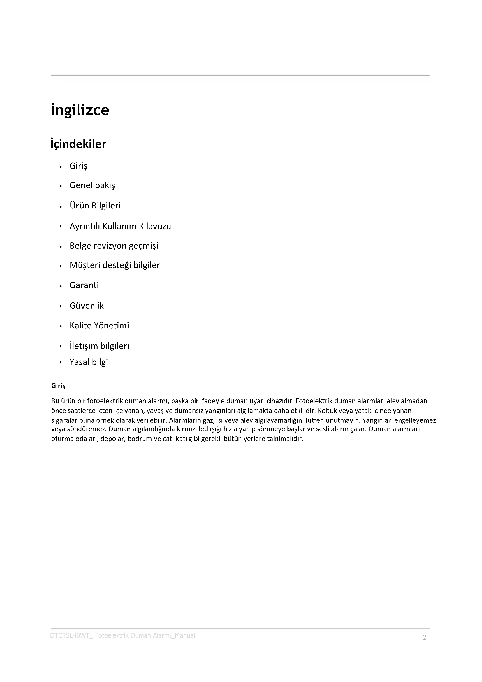 Yasalbilgi Giriş Buürünbirfotoelektrikdumanalarmı,başkabirifadeyledumanuyarıcihazıdır.Fotoelektrikdumanalarmlarıalevalmadan öncesaatlerceiçteniçeyanan,yavaşvedumansızyangınlarıalgılamaktadahaetkilidir.Koltukveyayatakiçindeyanan sigaralarbunaörnekolarakverilebilir.Alarmlarıngaz,ısıveyaalevalgılayamadığınılütfenunutmayın.Yangınlarıen gelleyemez veyasöndüremez.Dumanalgılandığındakırmızıledışığıhızlayanıpsönmeyebaşlarveseslialarmçalar.Dumanalarmları oturmaodaları,depolar,bodrumveçatıkatıgibigereklibütünyerleretakılmalıdır. DTCTSL40WT_ Fotoelektrik Duman Alarmı_Manual