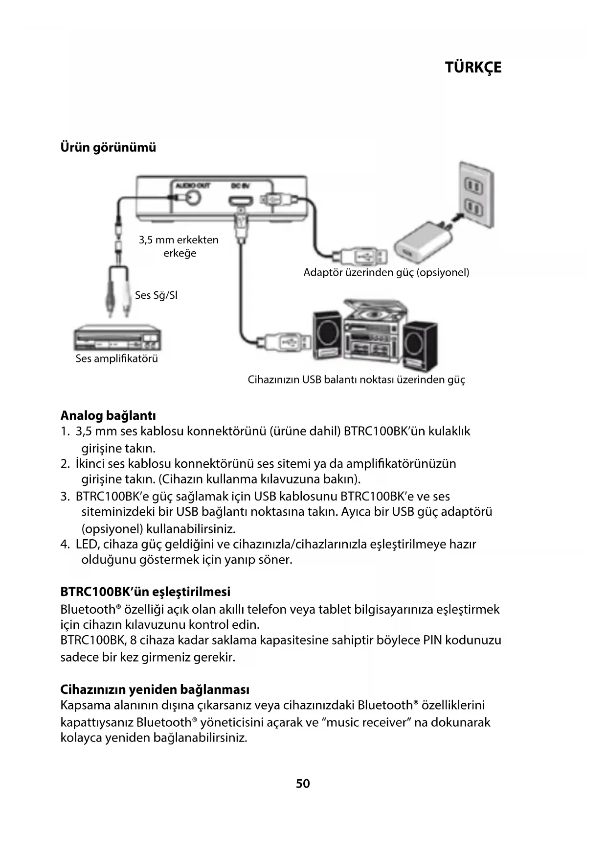 2. BTRC100BK artık başka bir cihaza bağlanmak üzere hardır.
