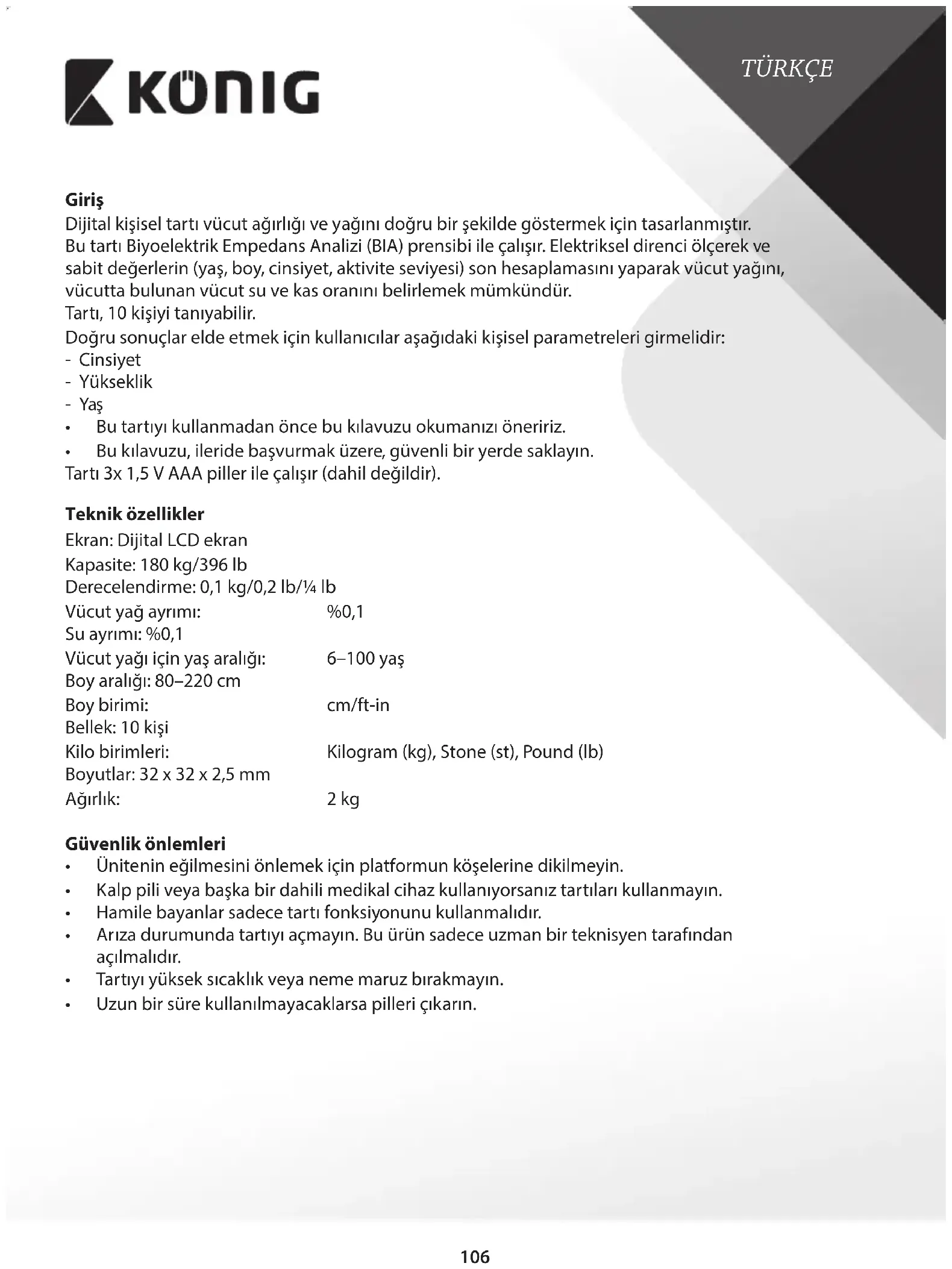 - Bu kılavuzu, ileride başvurmak üzere, güvenli bir yerde saklayın. Tartı 3x 1,5 V AAA piller ile çalışır (dahil değildir). Teknik özellikler Ekran: Dijital LCD ekran Kapasite: 180 kg/396 lb Derecelendirme: 0,1 kg/0,2 lb/¼ lb Vücut yağ ayrımı: %0,1 Su ayrımı: %0,1 Vücut yağı için yaş aralığı: 6–100 yaş Boy aralığı: 80–220 cm Boy birimi: cm/ft-in Bellek: 10 kişi Kilo birimleri: Kilogram (kg), Stone (st), Pound (lb) Boyutlar: 32 x 32 x 2,5 mm Ağırlık: 2 kg Güvenlik önlemleri