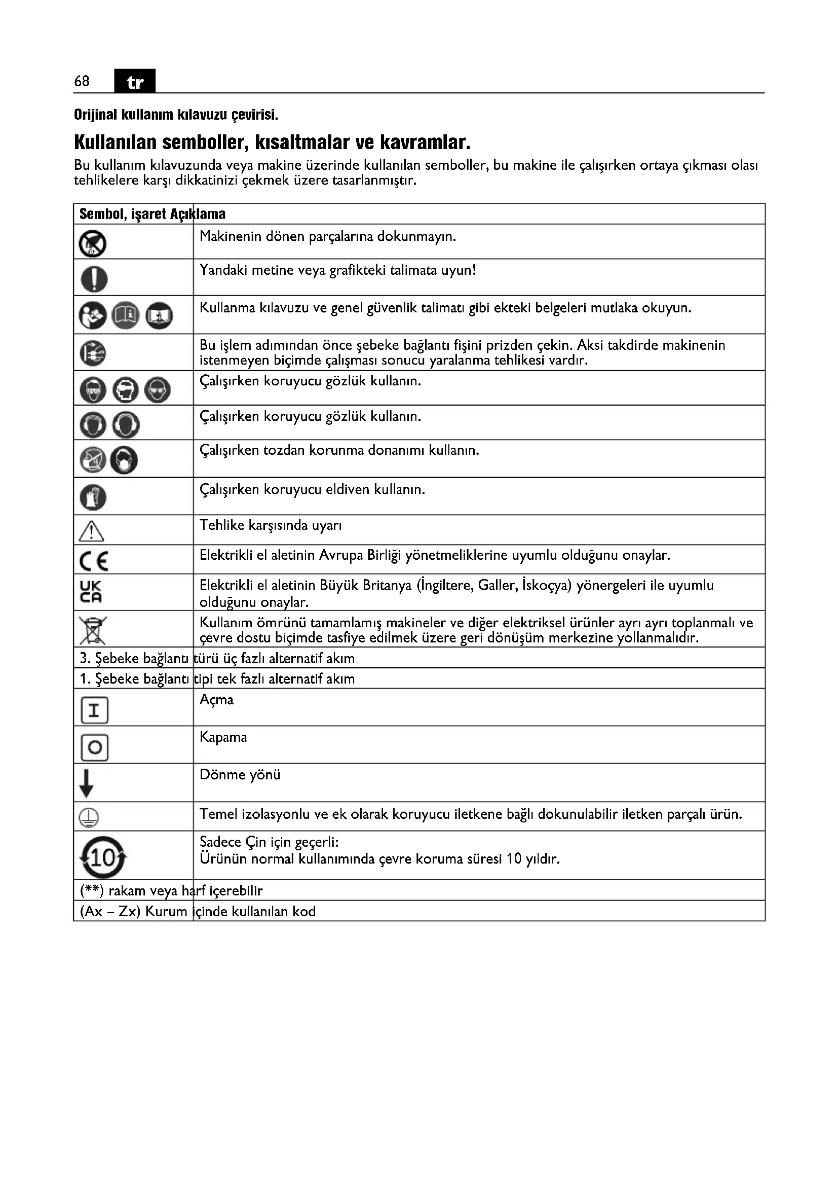 Orijinal kullanım kılavuzu çevirisi. Kullanılan semboller, kısaltmalar ve kavramlar. Bu kullanım kılavuzunda veya makine üzerinde kullanılan semboller, bu makine ile çalışırken ortaya çıkması olası tehlikelere karşı dikkatinizi çekmek üzere tasarlanmıştır. Sembol, işaret Açıklama Makinenin dönen parçalarına dokunmayın. Yandaki metine veya grafikteki talimata uyun! Kullanma kılavuzu ve genel güvenlik talimatı gibi ekteki belgeleri mutlaka okuyun. Bu işlem adımından önce şebeke bağlantı fişini prizden çekin. Aksi takdirde makinenin istenmeyen biçimde çalışması sonucu yaralanma tehlikesi vardır. Çalışırken koruyucu gözlük kullanın. Çalışırken koruyucu gözlük kullanın. Çalışırken tozdan korunma donanımı kullanın. Çalışırken koruyucu eldiven kullanın. Tehlike karşısında uyarı Elektrikli el aletinin Avrupa Birliği yönetmeliklerine uyumlu olduğunu onaylar. Elektrikli el aletinin Büyük Britanya (İngiltere, Galler, İskoçya) yönergeleri ile uyumlu olduğunu onaylar. Kullanım ömrünü tamamlamış makineler ve diğer elektriksel ürünler ayrı ayrı toplanmalı ve çevre dostu biçimde tasfiye edilmek üzere geri dönüşüm merkezine yollanmalıdır.