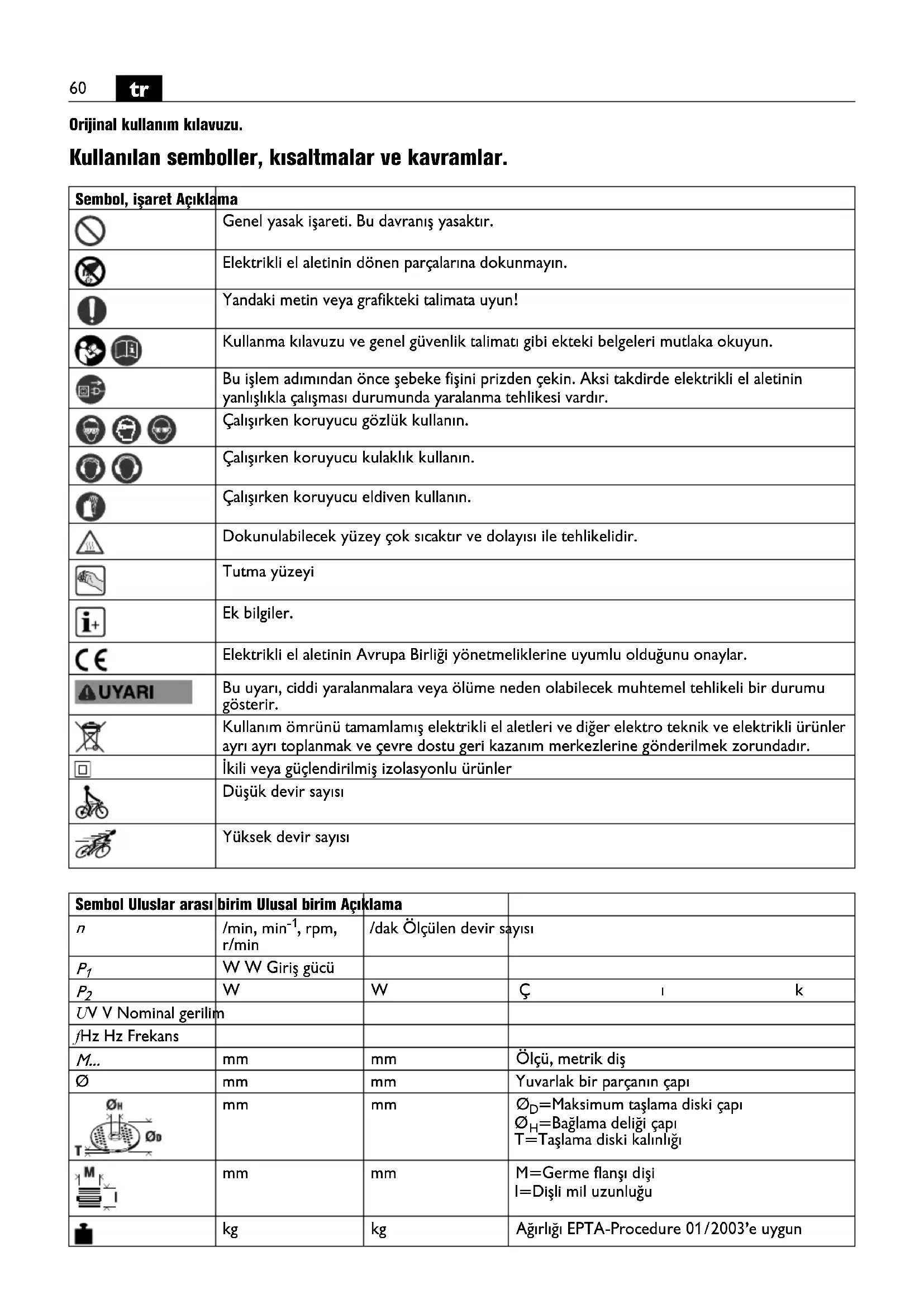 Orijinal kullanım kılavuzu. Kullanılan semboller, kısaltmalar ve kavramlar. Sembol, işaret Açıklama Genel yasak işareti. Bu davranış yasaktır. Elektrikli el aletinin dönen parçalarına dokunmayın. Yandaki metin veya grafikteki talimata uyun! Kullanma kılavuzu ve genel güvenlik talimatı gibi ekteki belgeleri mutlaka okuyun. Bu işlem adımından önce şebeke fişini prizden çekin. Aksi takdirde elektrikli el aletinin yanlışlıkla çalışması durumunda yaralanma tehlikesi vardır. Çalışırken koruyucu gözlük kullanın. Çalışırken koruyucu kulaklık kullanın. Çalışırken koruyucu eldiven kullanın. Dokunulabilecek yüzey çok sıcaktır ve dolayısı ile tehlikelidir. Tutma yüzeyi Ek bilgiler. Elektrikli el aletinin Avrupa Birliği yönetmeliklerine uyumlu olduğunu onaylar. Bu uyarı, ciddi yaralanmalara veya ölüme neden olabilecek muhtemel tehlikeli bir durumu gösterir. Kullanım ömrünü tamamlamış elektrikli el aletleri ve diğer elektro teknik ve elektrikli ürünler ayrı ayrı toplanmak ve çevre dostu geri kazanım merkezlerine gönderilmek zorundadır. İkili veya güçlendirilmiş izolasyonlu ürünler Düşük devir sayısı Yüksek devir sayısı Sembol Uluslar arası birim Ulusal birim Açıklama