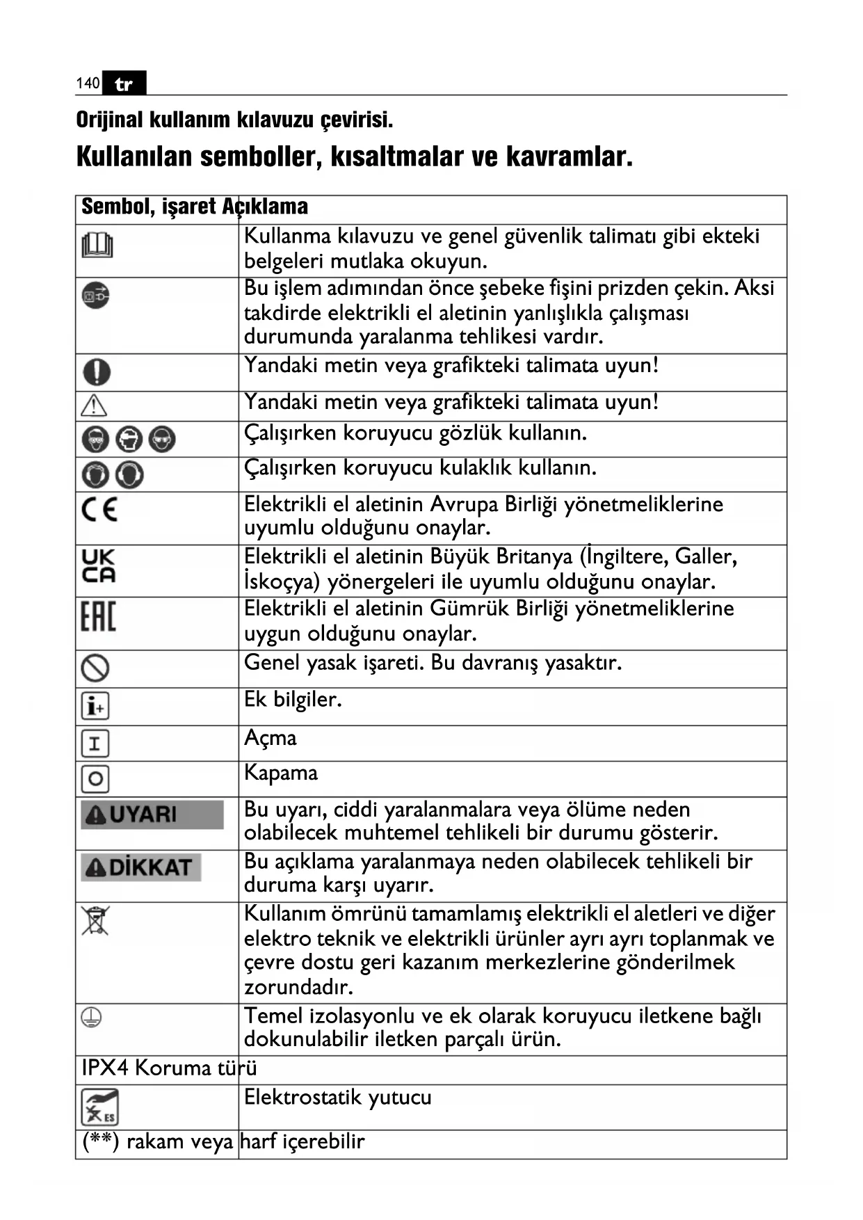 Orijinal kullanım kılavuzu çevirisi. Kullanılan semboller, kısaltmalar ve kavramlar. Sembol, işaret Açıklama Kullanma kılavuzu ve genel güvenlik talimatı gibi ekteki belgeleri mutlaka okuyun. Bu işlem adımından önce şebeke fişini prizden çekin. Aksi takdirde elektrikli el aletinin yanlışlıkla çalışması durumunda yaralanma tehlikesi vardır. Yandaki metin veya grafikteki talimata uyun! Yandaki metin veya grafikteki talimata uyun! Çalışırken koruyucu gözlük kullanın. Çalışırken koruyucu kulaklık kullanın. Elektrikli el aletinin Avrupa Birliği yönetmeliklerine uyumlu olduğunu onaylar. Elektrikli el aletinin Büyük Britanya (İngiltere, Galler, İskoçya) yönergeleri ile uyumlu olduğunu onaylar. Elektrikli el aletinin Gümrük Birliği yönetmeliklerine uygun olduğunu onaylar. Genel yasak işareti. Bu davranış yasaktır. Ek bilgiler. Açma Kapama Bu uyarı, ciddi yaralanmalara veya ölüme neden olabilecek muhtemel tehlikeli bir durumu gösterir. Bu açıklama yaralanmaya neden olabilecek tehlikeli bir duruma karşı uyarır. Kullanım ömrünü tamamlamış elektrikli el aletleri ve diğer elektro teknik ve elektrikli ürünler ayrı ayrı toplanmak ve çevre dostu geri kazanım merkezlerine gönderilmek zorundadır. Temel izolasyonlu ve ek olarak koruyucu iletkene bağlı dokunulabilir iletken parçalı ürün. IPX4 Koruma türü Elektrostatik yutucu (**) rakam veya harf içerebilir141