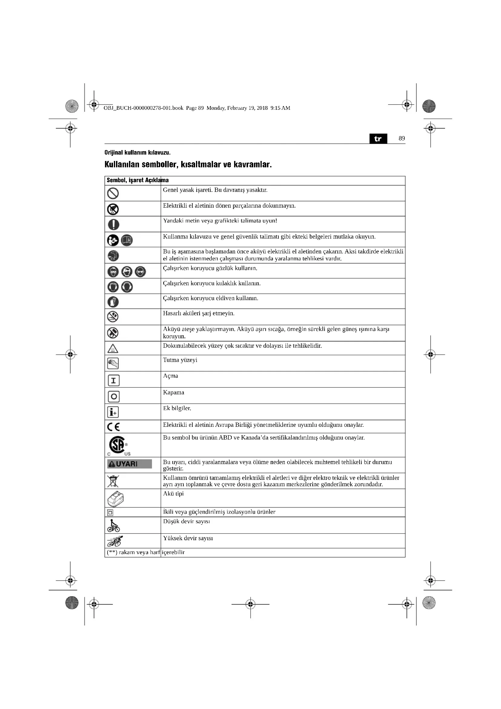 Orijinal kullanım kılavuzu. Kullanılan semboller, kısaltmalar ve kavramlar. Sembol, işaret Açıklama Genel yasak işareti. Bu davranış yasaktır. Elektrikli el aletinin dönen parçalarına dokunmayın. Yandaki metin veya grafikteki talimata uyun! Kullanma kılavuzu ve genel güvenlik talimatı gibi ekteki belgeleri mutlaka okuyun. Bu iş aşamasına başlamadan önce aküyü elektrikli el aletinden çakarın. Aksi takdirde elektrikli el aletinin istenmeden çalışması durumunda yaralanma tehlikesi vardır. Çalışırken koruyucu gözlük kullanın. Çalışırken koruyucu kulaklık kullanın. Çalışırken koruyucu eldiven kullanın. Hasarlı aküleri şarj etmeyin. Aküyü ateşe yaklaştırmayın. Aküyü aşırı sıcağa, örneğin sürekli gelen güneş ışınına karşı koruyun. Dokunulabilecek yüzey çok sıcaktır ve dolayısı ile tehlikelidir. Tutma yüzeyi Açma Kapama Ek bilgiler. Elektrikli el aletinin Avrupa Birliği yönetmeliklerine uyumlu olduğunu onaylar. Bu sembol bu ürünün ABD ve Kanada’da sertifikalandırılmış olduğunu onaylar. Bu uyarı, ciddi yaralanmalara veya ölüme neden olabilecek muhtemel tehlikeli bir durumu gösterir. Kullanım ömrünü tamamlamış elektrikli el aletleri ve diğer elektro teknik ve elektrikli ürünler ayrı ayrı toplanmak ve çevre dostu geri kazanım merkezlerine gönderilmek zorundadır. Akü tipi İkili veya güçlendirilmiş izolasyonlu ürünler Düşük devir sayısı Yüksek devir sayısı (**) rakam veya harf içerebilir OBJ_BUCH-0000000278-001.book Page 89 Monday, February 19, 2018 9:15 AM90