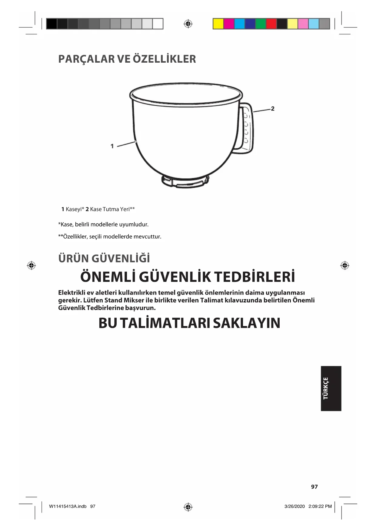 Elektrikli ev aletleri kullanılırken temel güvenlik önlemlerinin daima uygulanması gerekir. Lütfen Stand Mikser ile birlikte verilen Talimat kılavuzunda belirtilen Önemli Güvenlik Tedbirlerine başvurun.