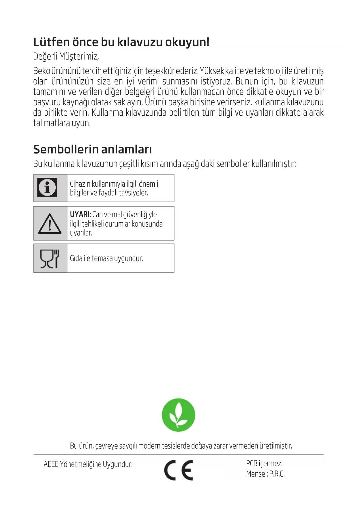 - Pendant la manipulation et le transport, portez toujours l’appareil dans son emballage d’origine. L’emballage de l’appareil le protège des dommages physiques. • Ne placez pas de charge lourde sur l’appareil ou sur l’emballage. Cela pourrait l’endommager. • Toute chute de l’appareil peut le rendre non opérationnel ou l’endommager de façon permanente.Lütfen önce bu kılavuzu okuyun! Değerl Müştermz, Beko ürününü terch ettğnz çn teşekkür ederz. Yüksek kalte ve teknoloj le üretlmş olan ürününüzün sze en y verm sunmasını styoruz. Bunun çn, bu kılavuzun tamamını ve verlen dğer belgeler ürünü kullanmadan önce dkkatle okuyun ve br başvuru kaynağı olarak saklayın. Ürünü başka brsne verrsenz, kullanma kılavuzunu da brlkte vern. Kullanma kılavuzunda belrtlen tüm blg ve uyarıları dkkate alarak talmatlara uyun. Sembollerin anlamları Bu kullanma kılavuzunun çeştl kısımlarında aşağıdak semboller kullanılmıştır: