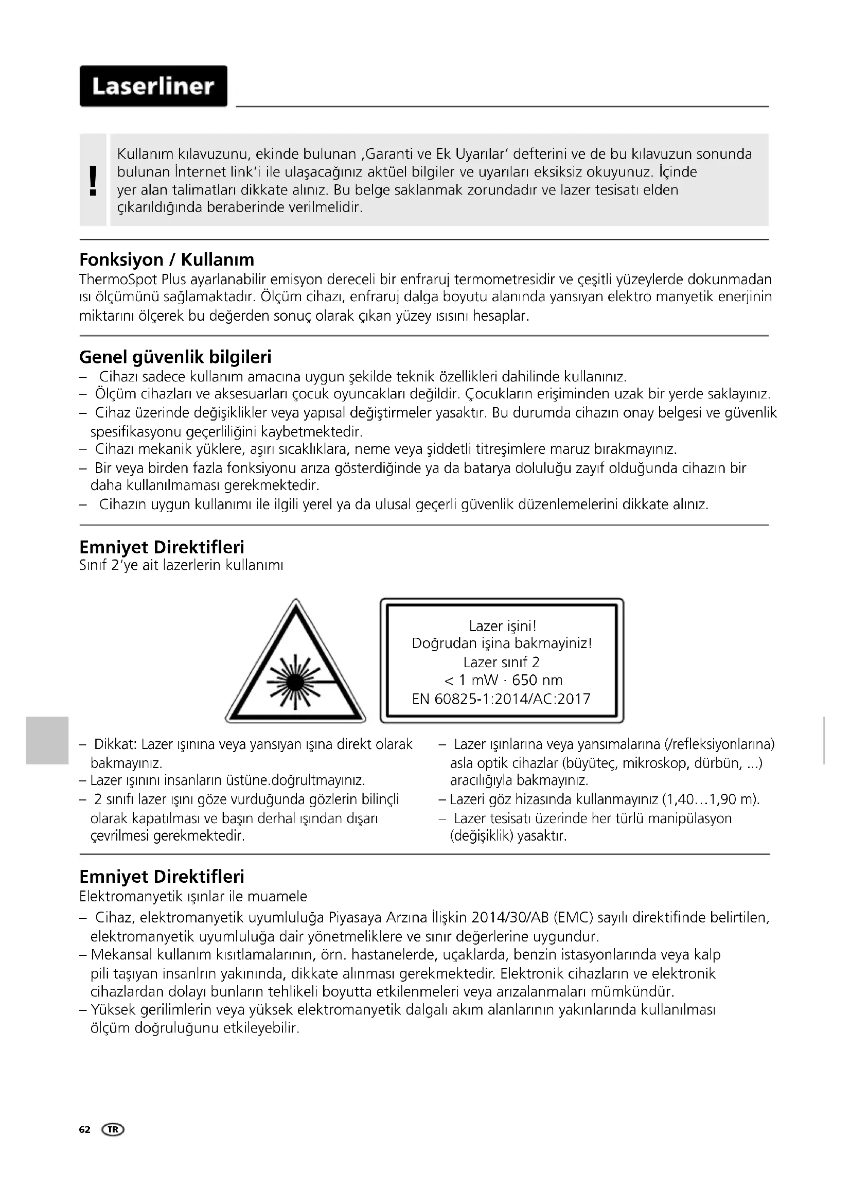 Fonksiyon / Kullanım ThermoSpot Plus ayarlanabilir emisyon dereceli bir enfraruj termometresidir ve çeşitli yüzeylerde dokunmadan ısı ölçümünü sağlamaktadır. Ölçüm cihazı, enfraruj dalga boyutu alanında yansıyan elektro manyetik enerjinin miktarını ölçerek bu değerden sonuç olarak çıkan yüzey ısısını hesaplar. Lazer işini! Doğrudan işina bakmayiniz! Lazer sınıf 2 < 1 mW · 650 nm EN 60825-1:2014/AC:2017 Genel güvenlik bilgileri – Cihazı sadece kullanım amacına uygun şekilde teknik özellikleri dahilinde kullanınız. – Ölçüm cihazları ve aksesuarları çocuk oyuncakları değildir. Çocukların erişiminden uzak bir yerde saklayınız. – Cihaz üzerinde değişiklikler veya yapısal değiştirmeler yasaktır. Bu durumda cihazın onay belgesi ve güvenlik spesikasyonu geçerliliğini kaybetmektedir. – Cihazı mekanik yüklere, aşırı sıcaklıklara, neme veya şiddetli titreşimlere maruz bırakmayınız. – Bir veya birden fazla fonksiyonu arıza gösterdiğinde ya da batarya doluluğu zayıf olduğunda cihazın bir daha kullanılmaması gerekmektedir. – Cihazın uygun kullanımı ile ilgili yerel ya da ulusal geçerli güvenlik düzenlemelerini dikkate alınız. Emniyet Direktieri Sınıf 2‘ye ait lazerlerin kullanımı – Dikkat: Lazer ışınına veya yansıyan ışına direkt olarak bakmayınız. – Lazer ışınını insanların üstüne.doğrultmayınız. – 2 sınıfı lazer ışını göze vurduğunda gözlerin bilinçli olarak kapatılması ve başın derhal ışından dışarı çevrilmesi gerekmektedir. – Lazer ışınlarına veya yansımalarına (/reeksiyonlarına) asla optik cihazlar (büyüteç, mikroskop, dürbün, ...) aracılığıyla bakmayınız. – Lazeri göz hizasında kullanmayınız (1,40…1,90 m). – Lazer tesisatı üzerinde her türlü manipülasyon (değişiklik) yasaktır. – Cihaz, elektromanyetik uyumluluğa Piyasaya Arzına İlişkin 2014/30/AB (EMC) sayılı direktinde belirtilen, elektromanyetik uyumluluğa dair yönetmeliklere ve sınır değerlerine uygundur. – Mekansal kullanım kısıtlamalarının, örn. hastanelerde, uçaklarda, benzin istasyonlarında veya kalp pili taşıyan insanlrın yakınında, dikkate alınması gerekmektedir. Elektronik cihazların ve elektronik cihazlardan dolayı bunların tehlikeli boyutta etkilenmeleri veya arızalanmaları mümkündür. – Yüksek gerilimlerin veya yüksek elektromanyetik dalgalı akım alanlarının yakınlarında kullanılması ölçüm doğruluğunu etkileyebilir. Emniyet Direktieri Elektromanyetik ışınlar ile muamele TRThermoSpot Plus