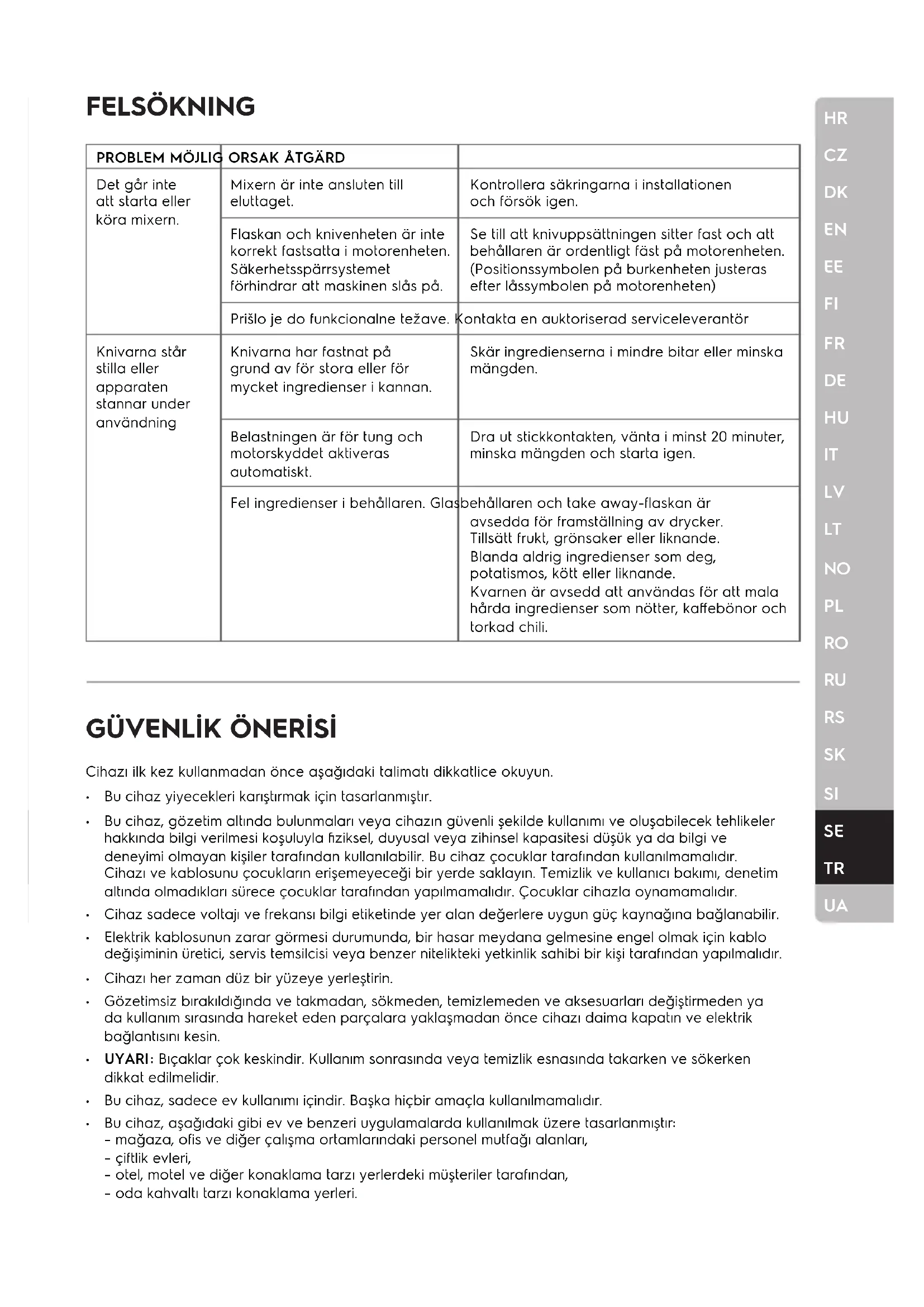 Blender açılmıyor veya çalıştırılamıyor. Blender elektrik prizine bağlı değildir. Evinizdeki elektriği kontrol edin ve cihazı tekrar prize takın. Şişe ve bıçak tertibatı, blender tabanına doğru şekilde takılmamıştır. İç güvenlik sistemi makinenin çalıştırılmasına engel olur. Bıçak tertibatının sıkıca yerleştirildiğinden ve sürahinin blender tabanına iyice oturduğundan emin olun. (Blender tabanındaki pozisyon sembolü, blender tabanındaki kilit sembolü ile aynı hizaya gelmelidir) Fonksiyonel bir sorun olabilir. Yetkili servis merkezine başvurun. Çalışma sırasında bıçaklar durur veya makine çalışmayı durdurur. Yiyecek parçaları çok büyük olduğu için ya da sürahide çok fazla yiyecek olduğu için bıçak sıkışmıştır. Yiyecekleri daha küçük parçalar halinde kesin ya da yiyecek miktarını biraz azaltın. Sürahiye yanlış malzemeler konulmuştur. Cam sürahi ve taşınabilir şişenin kullanım amacı içecek yapımıdır. Meyve, sebze ya da benzeri malzemeler ekleyin. Hamur, patates püresi, et vb. malzemeleri asla karıştırmayın. Blender ise kuruyemiş, kahve çekirdeği ve kurutulmuş biber gibi sert malzemeleri öğütmek için uygundur. Çok fazla malzeme doldurulduğu için motor koruyucu otomatik olarak etkinleşmiştir. Cihazı prizden çıkarın ve en az 20 dakika bekleyin, yiyecek miktarını biraz azaltın ve ardından tekrar başlatın.HR