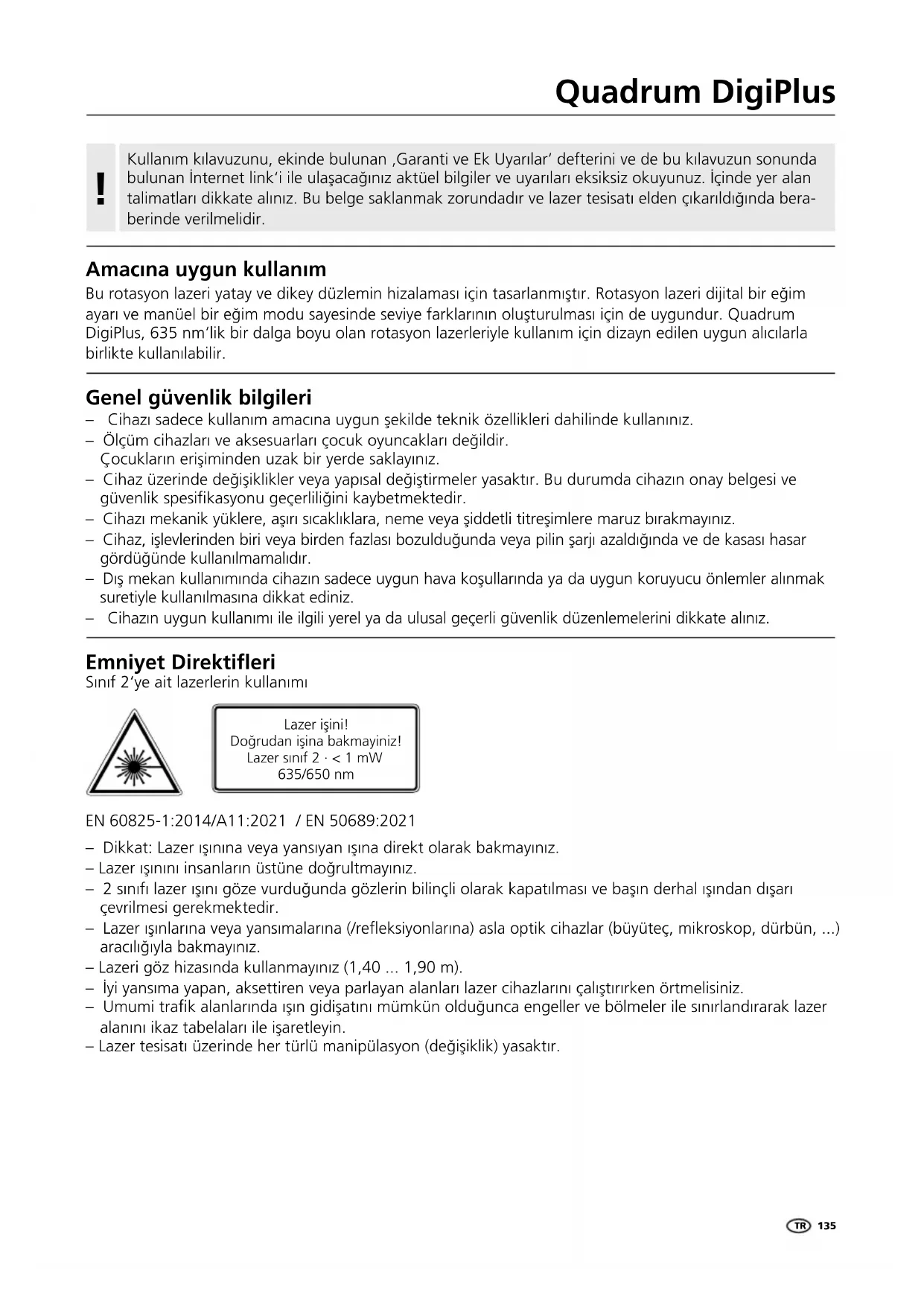 Amacına uygun kullanım Bu rotasyon lazeri yatay ve dikey düzlemin hizalaması için tasarlanmıştır. Rotasyon lazeri dijital bir eğim ayarı ve manüel bir eğim modu sayesinde seviye farklarının oluşturulması için de uygundur. Quadrum DigiPlus, 635 nm‘lik bir dalga boyu olan rotasyon lazerleriyle kullanım için dizayn edilen uygun alıcılarla birlikte kullanılabilir. Genel güvenlik bilgileri – Cihazı sadece kullanım amacına uygun şekilde teknik özellikleri dahilinde kullanınız. – Ölçüm cihazları ve aksesuarları çocuk oyuncakları değildir. Çocukların erişiminden uzak bir yerde saklayınız. – Cihaz üzerinde değişiklikler veya yapısal değiştirmeler yasaktır. Bu durumda cihazın onay belgesi ve güvenlik spesikasyonu geçerliliğini kaybetmektedir. – Cihazı mekanik yüklere, aşırı sıcaklıklara, neme veya şiddetli titreşimlere maruz bırakmayınız. – Cihaz, işlevlerinden biri veya birden fazlası bozulduğunda veya pilin şarjı azaldığında ve de kasası hasar gördüğünde kullanılmamalıdır. – Dış mekan kullanımında cihazın sadece uygun hava koşullarında ya da uygun koruyucu önlemler alınmak suretiyle kullanılmasına dikkat ediniz. – Cihazın uygun kullanımı ile ilgili yerel ya da ulusal geçerli güvenlik düzenlemelerini dikkate alınız. EN 60825-1:2014/A11:2021 / EN 50689:2021 Emniyet Direktifleri Sınıf 2‘ye ait lazerlerin kullanımı – Dikkat: Lazer ışınına veya yansıyan ışına direkt olarak bakmayınız. – Lazer ışınını insanların üstüne doğrultmayınız. – 2 sınıfı lazer ışını göze vurduğunda gözlerin bilinçli olarak kapatılması ve başın derhal ışından dışarı çevrilmesi gerekmektedir. – Lazer ışınlarına veya yansımalarına (/reeksiyonlarına) asla optik cihazlar (büyüteç, mikroskop, dürbün, ...) aracılığıyla bakmayınız. – Lazeri göz hizasında kullanmayınız (1,40 ... 1,90 m). – İyi yansıma yapan, aksettiren veya parlayan alanları lazer cihazlarını çalıştırırken örtmelisiniz. – Umumi trak alanlarında ışın gidişatını mümkün olduğunca engeller ve bölmeler ile sınırlandırarak lazer alanını ikaz tabelaları ile işaretleyin. – Lazer tesisatı üzerinde her türlü manipülasyon (değişiklik) yasaktır. Lazer işini! Doğrudan işina bakmayiniz! Lazer sınıf 2 · < 1 mW 635/650 nm136