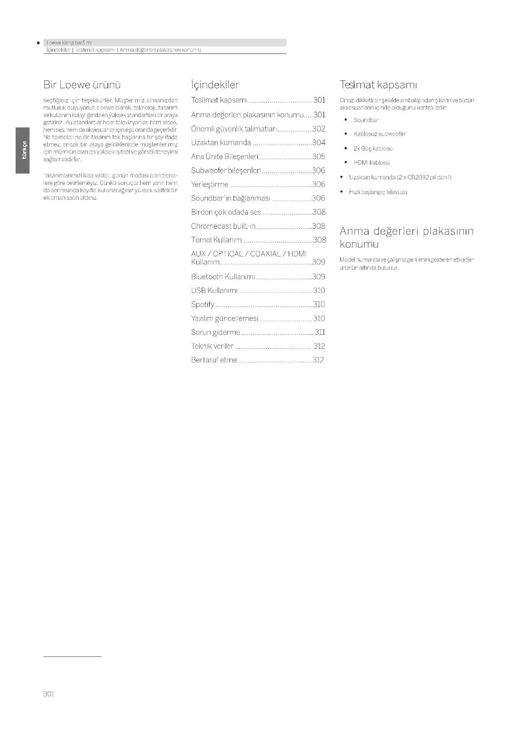 - Loewe klang bar5 mr deutsch türkçe İçindekiler | Teslimat kapsamı | Anma değerleri plakasının konumu Bir Loewe ürünü seçtiğiniz için teşekkürler. Müşterimiz olmanızdan mutluluk duyuyoruz. Loewe olarak, teknoloji, tasarım ve kullanım kolaylığında en yüksek standartları bir araya getiririz. Bu standartlar hem televizyonlar, hem video, hem ses, hem de aksesuarlar için eşit oranda geçerlidir. Ne teknoloji ne de tasarım tek başlarına bir şey ifade etmez, ancak bir araya geldiklerinde müşterilerimiz için mümkün olan en yüksek işitsel ve görsel deneyimi sağlamalıdırlar. Tasarımlarımızı kısa vadeli, günün modası olan trend- lere göre belirlemeyiz. Çünkü sonuçta hem yarın hem de sonrasında keyifle kullanacağınız yüksek kaliteli bir ekipman satın aldınız. İçindekiler Tesl imat kapsamı p. 301
