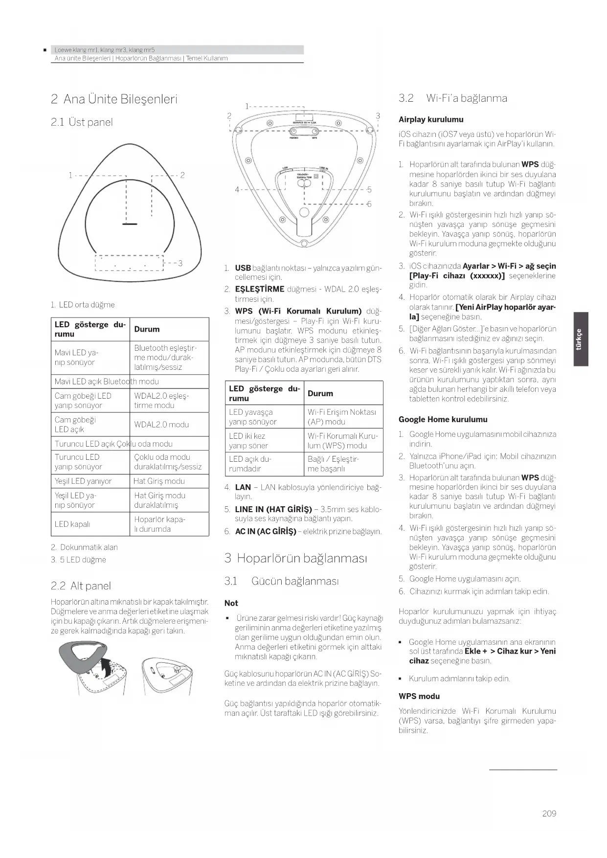 Hoparlör kurulumunuzu yapmak için ihtiyaç duyduğunuz adımları bulamazsanız: Google Home uygulamasının ana ekranının sol üst tarafında Ekle + > Cihaz kur > Yeni cihaz seçeneğine basın. Kurulum adımlarını takip edin. WPS modu Yönlendiricinizde Wi-Fi Korumalı Kurulumu (WPS) varsa, bağlantıyı şifre girmeden yapa- bilirsiniz. Ana ünite Bileşenleri | Hoparlörün Bağlanması | Temel Kullanım