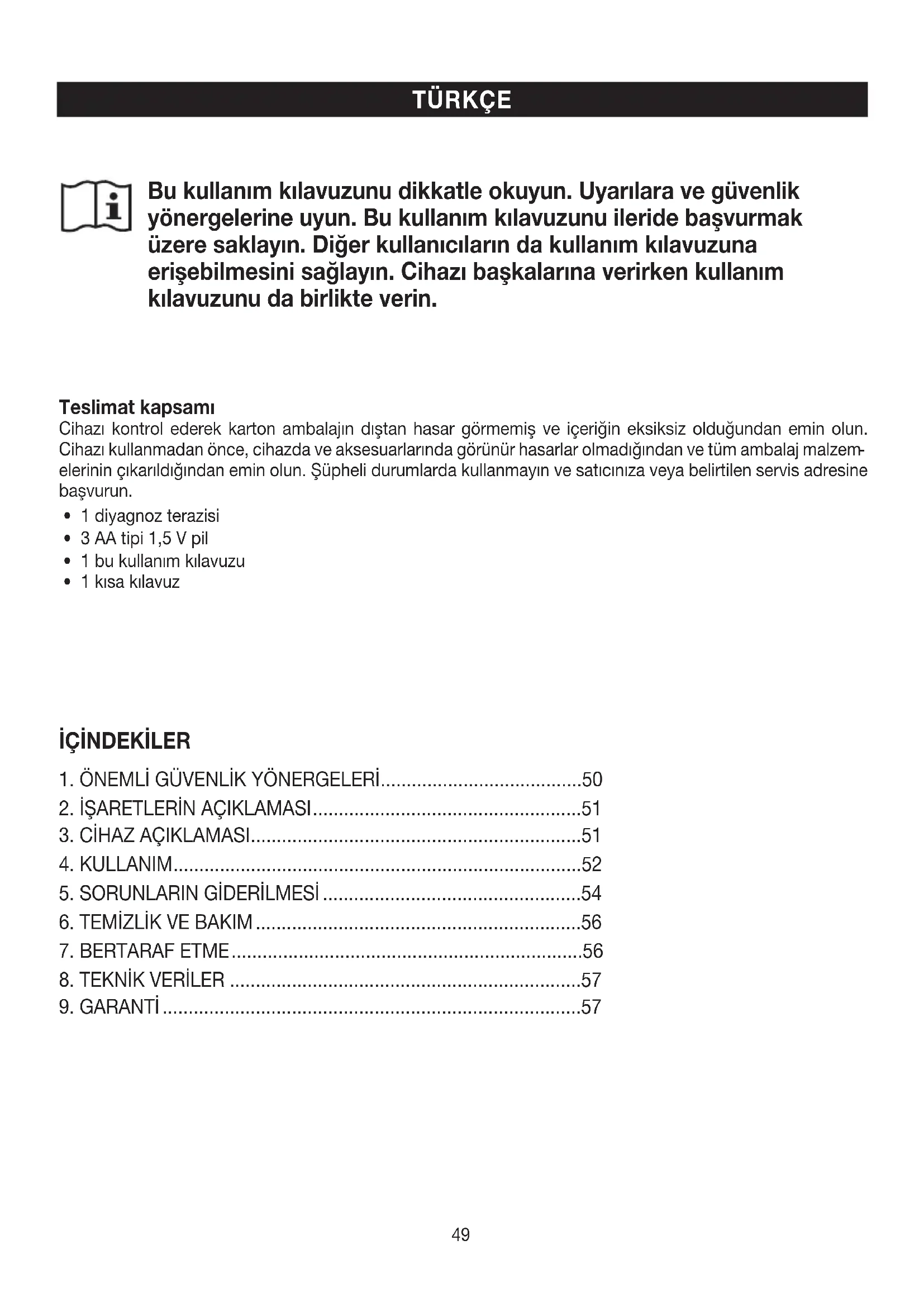 İÇİNDEKİLER Teslimat kapsamı Cihazı kontrol ederek karton ambalajın dıştan hasar görmemiş ve içeriğin eksiksiz olduğundan emin olun. Cihazı kullanmadan önce, cihazda ve aksesuarlarında görünür hasarlar olmadığından ve tüm ambalaj malzem