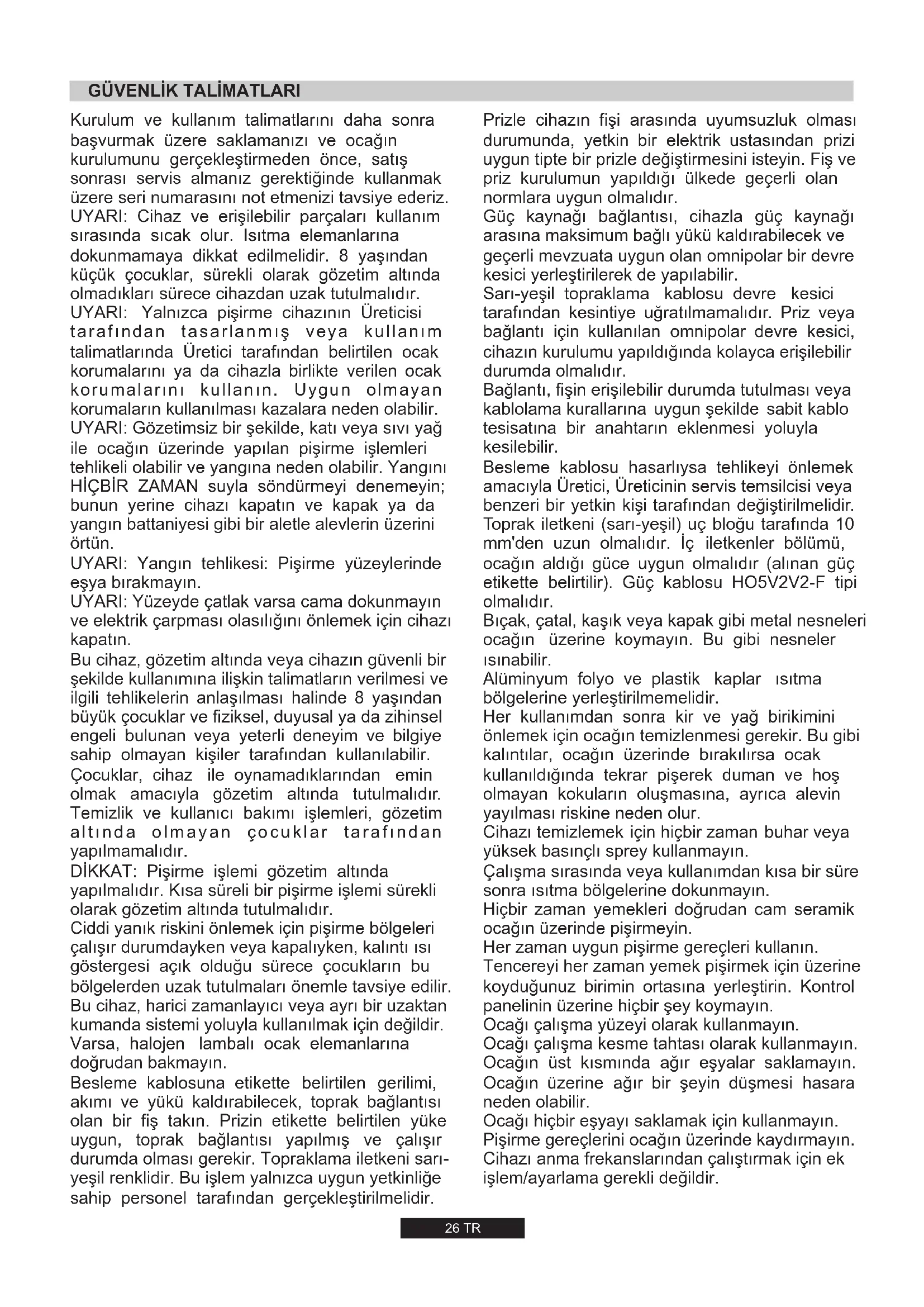 Ocağın doğrudan bir elektrik kaynağına bağlandığı yerde, bir devre kesicisi (şalter) tesis edilmelidir. Ünitenin dışına yerleştirilmiş olan değer plakasındaki verilerin, güç kaynağı ve giriş voltajı değerlerine uygun olduğunu kontrol edin. Bağlantı öncesinde, topraklama sistemini kontrol edin. Kanun gereğince, bu cihaz topraklanmalıdır. Bu düzenlemeye uyulmadığı taktirde, Üretici kişilere veya mülkiyete verilecek zararlardan sorumlu olmayacaktır. Fiş henüz takılmadıysa, değer plakasında gösterilen yüke uygun bir fiş takınız. Topraklama teli sarı/yeşil renklidir. Fiş her zaman erişilebilir durumda olmalıdır. Güç kaynağı kablosu zarar görürse, potansiyel bir riski önlemek için ehliyetli bir mühendis tarafından değiştirilmelidir. Topraklama kablosu (yeşil veya sarı renkli) aktif ve nötr kablolardan en az 10 mm daha uzun olmalıdır. Kullanılan kablo bölümü, ocağın çektiği elektriğe göre uygun ölçülerde olmalıdır. Lütfen güç bilgileri için değer plakasını kontrol edin ve güç kaynağı kablosunun 3x0.75 mm² H05 V2V2-F, tipinde olmasını sağlayın. AKTİF TOPRAK NOTR