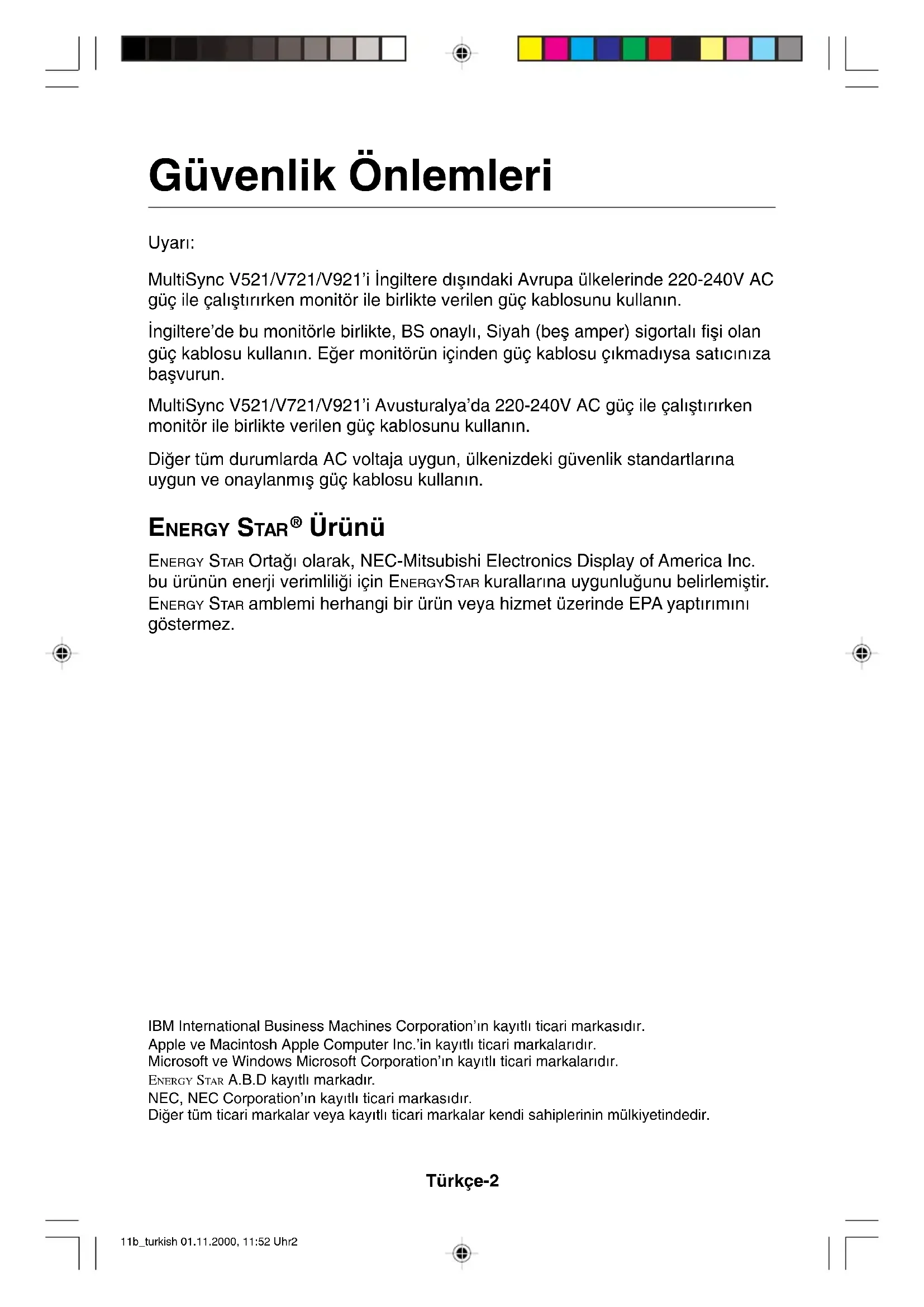 11b_turkish 01.11.2000, 11:52 Uhr1Türkçe-2 Güvenlik Önlemleri Uyar∂: MultiSync V521/V721/V921’i ∑ngiltere d∂µ∂ndaki Avrupa ülkelerinde 220-240V AC güç ile çal∂µt∂r∂rken monitör ile birlikte verilen güç kablosunu kullan∂n. ∑ngiltere’de bu monitörle birlikte, BS onayl∂, Siyah (beµ amper) sigortal∂ fiµi olan güç kablosu kullan∂n. Eπer monitörün içinden güç kablosu ç∂kmad∂ysa sat∂c∂n∂za baµvurun. MultiSync V521/V721/V921’i Avusturalya’da 220-240V AC güç ile çal∂µt∂r∂rken monitör ile birlikte verilen güç kablosunu kullan∂n. Diπer tüm durumlarda AC voltaja uygun, ülkenizdeki güvenlik standartlar∂na uygun ve onaylanm∂µ güç kablosu kullan∂n. ENERGY STAR