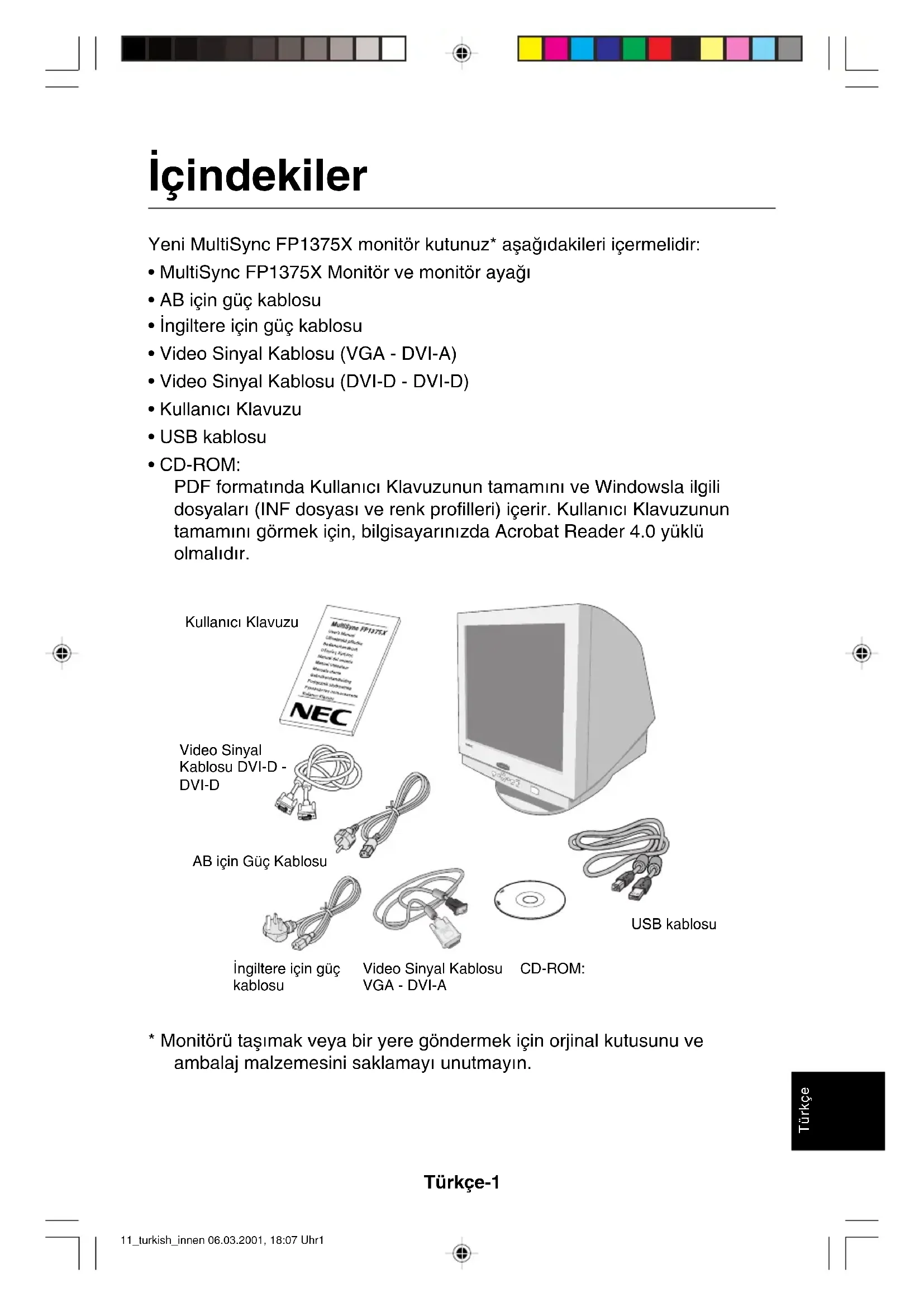 VCCI Statement 10_russian_innen 06.03.2001, 18:07 Uhr12Türkçe-1 Türkçe ∑çindekiler Yeni MultiSync FP1375X monitör kutunuz* aµaπ∂dakileri içermelidir:
