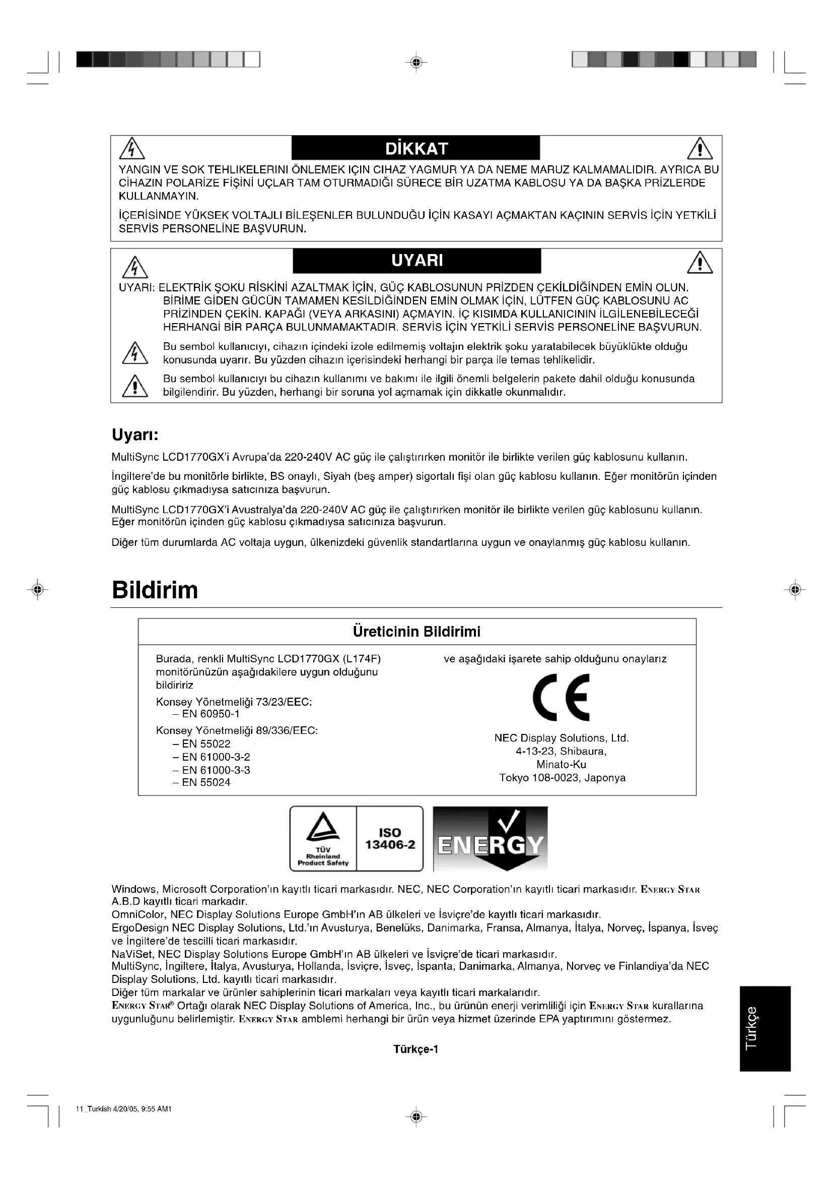 Orta©∂ olarak NEC Display Solutions of America, Inc., bu ürünün enerji verimlili©i için ENERGY STAR kurallar∂na uygunlu©unu belirlemiµtir. ENERGY STA R amblemi herhangi bir ürün veya hizmet üzerinde EPA yapt∂r∂m∂n∂ göstermez. 11_Turkish 4/20/05, 9:55 AM1Türkçe-2