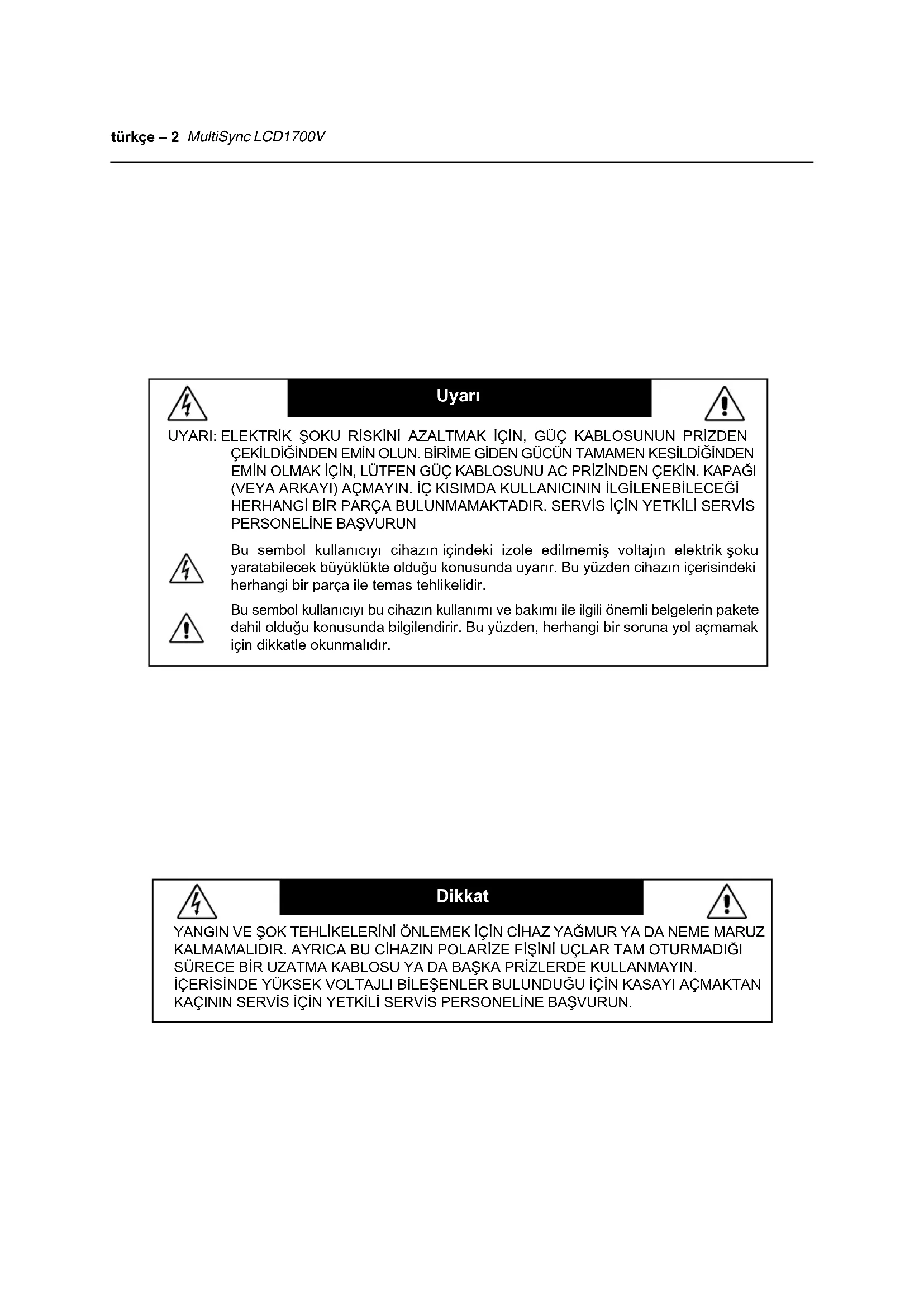 1280 X 1024 FV : 60 Hz FH : 64 KHzOSD Fonksiyon Tanimi Kullanici Kilavuzu türkçe 7 Madde Fonksiyon Tanýmý BRIGHTNESS Parlaklýðý arttýrmak veya azaltmak için. (PARLAKLIK) CONTRAST Kontrastý arttýrmak veya azaltmak için; kaba ayar. Tavsiye edilen deðer 50. (KONTRAST) ANALOG CONTRAST Kontrastý arttýrmak veya azaltmak için; ince ayar. (ANALOG KONTRAST) CONTRASTýn önce 50 olarak ayarlanmasýný tavsiye ederiz. AUTO CONTRAST Standart olmayan video giriþleri için görüntüyü ayarlar. (OTOMATÝK KONTRAST) COLOR TEMPERATURE 9300, 7500, 5500, NATIVE and USER seçmek için - veya + ya basmak. (RENK ISISI) Sadece USER seçerken, R/G/B ayarlarýný yapabilirsiniz, aksi takdirde yapamazsýnýz. Fabrika ayarlarýna gei dönmek için "+ ve - ya ayný anda basýn. AUTO ADJUST Bu fonksiyonu açmak için + ya basýn. (OTOMATÝK AYAR) Auto-Adjust V-Position, H-Position, H. Size, ve Fine ayarlarýný otomatik olarak ayarlar, tüm iþlem yaklaþýk 5 saniye sürer. LEFT / RIGHT Ekraný sola veya saða kaydýrmak için. (SOL/SAÐ) UP / DOWN Ekraný aþaðý veya yukarý kaydýrmak için. (AÞAÐI/YUKARI) Auto Adjustment fonksiyonu size tatmin edici bir resim ayarý saðlamadýðý takdirde, daha ileri ayar H.Size fonksiyonu ile yapýlabilir (nokta saati). Bunun H. SIZE için Moiré test deseni kullanýlabilir. Bu fonksiyon resim (YATAY BOYUT) geniþliðini deðiþtirebilir. Görüntüyü ekranda ortalamak için Left/Right Menu yü kullanýn. Eðer H.Size yanlýþ kalibre edilirse, sonuç bu çizimdeki gibi olacaktýr. Görüntü homojen olmalýdýr. Auto Adjustment fonksiyonu ve H.Size fonksiyonu tatmin edici görüntü ayarý saðlamazsa, Fine fonksiyonu ile ince ayar yapýlabilir. Bu ayarýn FINE arttýrýlmasý veya azaltýlmasý, odak, netlik ve görüntü (ÝNCE) stabilitesini geliþtirir. Bunun için Moiré test deseni kullanýlabilir. Eðer Fine deðeri yanlýþ kalibre edilirse, sonuç bu çizimdeki gibi olacaktýr. Görüntü homojen olmalýdýr. Not: Yukarýdaki ayar iþlemleri için, + and - ayný anda basmak fabrika ayarlarýna geri döndürecektir.english 8 MultiSync LCD1700V OSD Fonksiyon Tanimi devam OSD Mesajlar CURRENT INPUT IS CURRENT INPUT IS DSUB ANALOG DSUB ANALOG BÝLGÝ O andaki çözünürlüðü gösterir. D-Frekans (FD), ve Y-Frekans (FY). NO SIGNAL INPUT Bu mesaj sinyal olmadýðýnda uyarýr. Madde Fonksiyon Tanýmý SATURATION Saturasyonu arttýrmak veya azaltmak için. HUE Hue arttýrmak veya azaltmak için. FLESH TONE Doðal renklerin renklerini ayarlamak için. LANGUAGE (DÝL) English, French, Italian, German ve Spanish arasýndan seçebilirsiniz RECALL DEFAULTS Monitörü varsayýlan deðerlerine döndürmek için. OSD TIMEOUT OSD menüsü kullanýmda olduðu sürece açýk kalacaktýr. OSD TIMEOUT menüsünde, OSD menüsünün kapatýlmasý için monitörün son düðmeye dokunulduktan sonra ne kadar bekleyeceðini seçebilirsiniz. Mevcut seçenekler, 10, 20, 45, 60 ve 90 saniyedir. OSD OSD pozisyonunu ekran üzerinde yatay olarak hareket ettirmek için. LEFT / RIGHT "+" tuþuna basýldýðýnda, OSD kontrol menüsü ekranýn saðýna doðru kayar. (SOL/SAÐ) Ayný þekilde "-" tuþuna basýldýðýnda, OSD kontrol menüsü ekranýn soluna doðru kayar. OSD OSD pozisyonunu ekran üzerinde dikey olarak hareket ettirmek için. UP / DOWN "+" tuþuna basýldýðýnda, OSD kontrol menüsü ekranýn yukarýsýna doðru kayar. (AÞAÐI/YUKARI) Ayný þekilde "-" tuþuna basýldýðýnda, OSD kontrol menüsü ekranýn soluna aþaðýsýna doðru kayar. EXPANSION Görüntü çözünürlüðe bakýlmaksýzýn 1280 x 1024e kadar geniþletilebilir. (GENÝÞLEME) - no seçer + yes seçer AUTO ADJUSTING Görüntü konumunu, Yatay Boyutu ve Ýnce ayarý otomatik olarak ayarlar. Bu iþlem yaklaþýk 5 saniye sürer. Not: Yukarýdaki ayar iþlemleri için, + and - ayný anda basmak fabrika ayarlarýna geri döndürecektir.Tavsiye Edilen Kullaným Güvenlik Uyarýlarý ve Bakým MULTISYNC LCD RENKLÝ MONÝTÖRÜ KURARKEN VE KULLANIRKEN EN ÝYÝ PERFORMANS ÝÇÝN LÜTFEN AÞAÐIDAKÝ NOKTALARA DÝKKAT EDÝN: MONÝTÖRÜ AÇMAYIN. Ýç kýsýmda kullanýcýnýn ilgilenebileceði herhangi bir parça bulunmamaktadýr ve kapaðý açmak ya da çýkartmak sizi ciddi þok tehlikeleri veya diðer risklere maruz býrakabilir. Tüm bakým iþleri için yetkili servis elemanlarýna baþvurun. Kasaya herhangi bir sývý dökmeyin ya da monitörünüzü su yakýnýnda kullanmayýn. Tehlikeli voltaj noktalarýna temas ederek, zararlý ya da öldürücü olabileceði veya elektrik þoku, yangýn ya da cihaz arýzasýna yol açabileceði için kasadaki yuvalara herhangi bir cisim sokmayýn. Güç kablosu üzerine aðýr cisimler koymayýn. Kablodaki hasar þok ya da yangýna yol açabilir. Monitörün düþmesine ve ciddi þekilde hasar görmesine sebep olabileceði için bu ürünü eðimli ya da dengesiz taþýyýcý, stand veya masa üzerine yerleþtirmeyin. MultiSync LCD1700Vu Ýngiltere dýþýndaki Avrupa ülkelerinde 220 - 240 V AC güç ile çalýþtýrýrken monitör ile birlikte verilen güç kablosunu kullanýn. Ýngilterede bu monitörle birlikte, BS onaylý, Siyah (beþ amper) sigortalý fiþi olan güç kablosu kullanýn. Eðer monitörün içinden güç kablosu çýkmadýysa satýcýnýza baþvurun. MultiSync LCD1700Vu Avusturalyada 220 - 240 V AC güç ile çalýþtýrýrken monitör ile birlikte verilen güç kablosunu kullanýn. Diðer tüm durumlarda AC voltaja uygun, ülkenizdeki güvenlik standartlarýna uygun ve onaylanmýþ güç kablosu kullanýn. Saðlanan AC Adaptörü kullanýn. AC Adaptörün üzerine herhangi birþey koymayýn ve AC Adaptörü dýþarýda kullanmayýn. Monitörün üzerine herhangi birþey koymayýn ve monitörü dýþarýda kullanmayýn. LCD monitörün içindeki florasan tüpün içinde cýva bulunmaktadýr. Bu tüpü atmanýz gerektiðinde lütfen belediyenizin yönetmelik ve kurallarýna uyun. Aþaðýdaki durumlarda, monitörünüzü hem