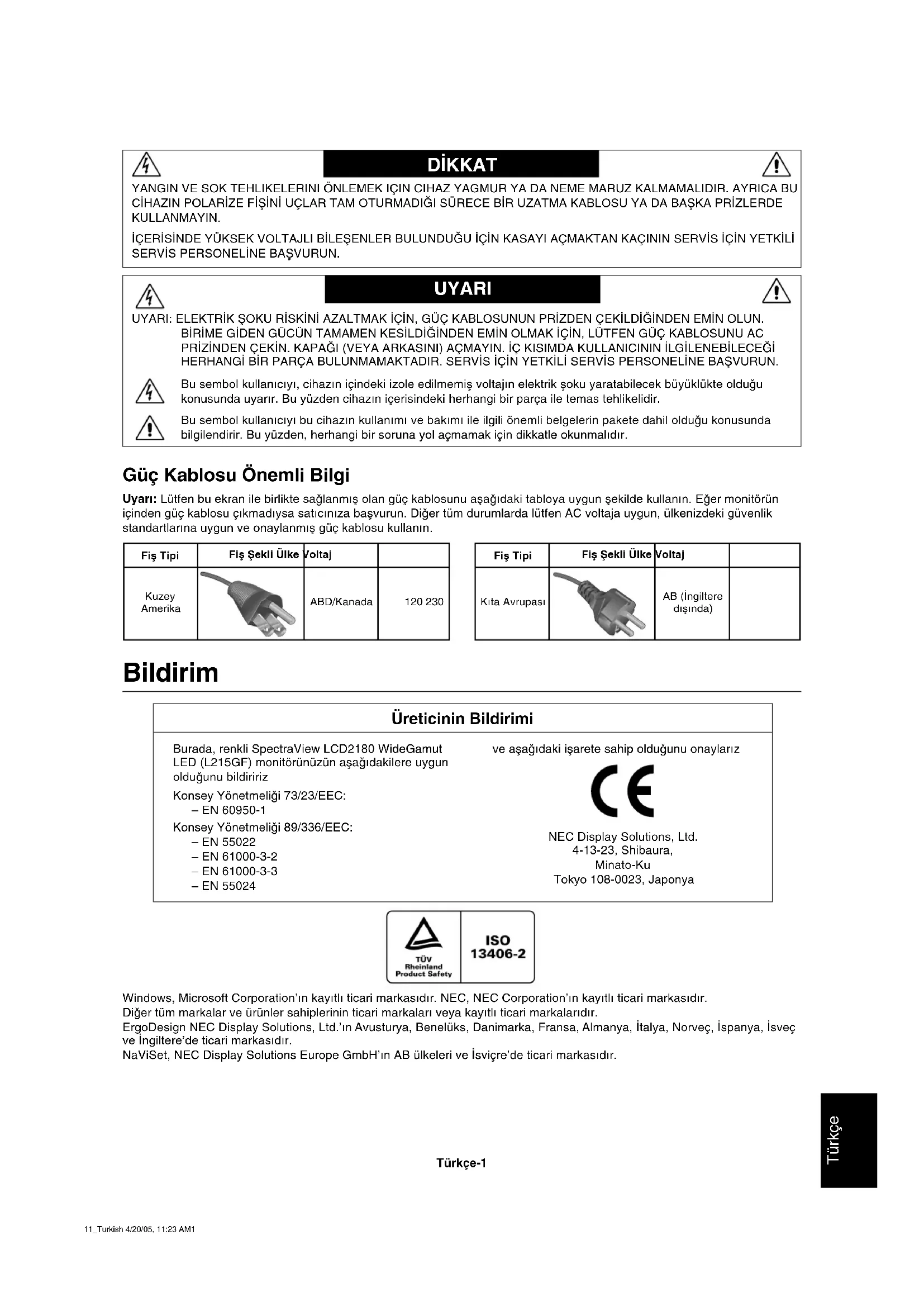 - Görüntü Sabitli©i: Görüntü sabitli©i, önceki görüntünün art∂k veya “hayalet” görüntüsünün ekranda görünür kalmas∂d∂r. CRT monitörlerden farkl∂ olarak, LCD monitörlerde görüntü sabitli©i kal∂c∂ de©ildir, ancak sabit görüntülerin uzun süre görüntülenmesinden kaç∂n∂lmal∂d∂r. Bunu düzeltmek için, monitörü önceki görüntünün kald∂©∂ süre kadar kapal∂ tutun. Örne©in, e©er görüntü monitörde bir saat kald∂ysa ve görüntünün “hayaleti” hala duruyorsa, monitör görüntünün silinmesi için bir saat kapal∂ kalmal∂d∂r. NOT: Tüm kiµisel görüntüleme ayg∂tlar∂nda oldu©u gibi, NEC DISPLAY SOLUTIONS ekran boµ kald∂©∂nda düzenli aral∂klarla ekran koruyucular∂n kullan∂m∂n∂ veya kullan∂lmad∂©∂nda monitörün kapat∂lmas∂n∂ tavsiye eder. UYARI 11_Turkish 4/20/05, 11:23 AM7Türkçe-8 MON∑TÖRÜN DO∏RU YERLEΩT∑R∑LMES∑ VE AYARLANMASI GÖZ, OMUZ VE BOYUN A∏RILARINI AZALTAB∑L∑R. MON∑TÖRÜNÜZÜ YERLEΩT∑R∑RKEN AΩA∏IDAK∑LERE D∑KKAT ED∑N:
