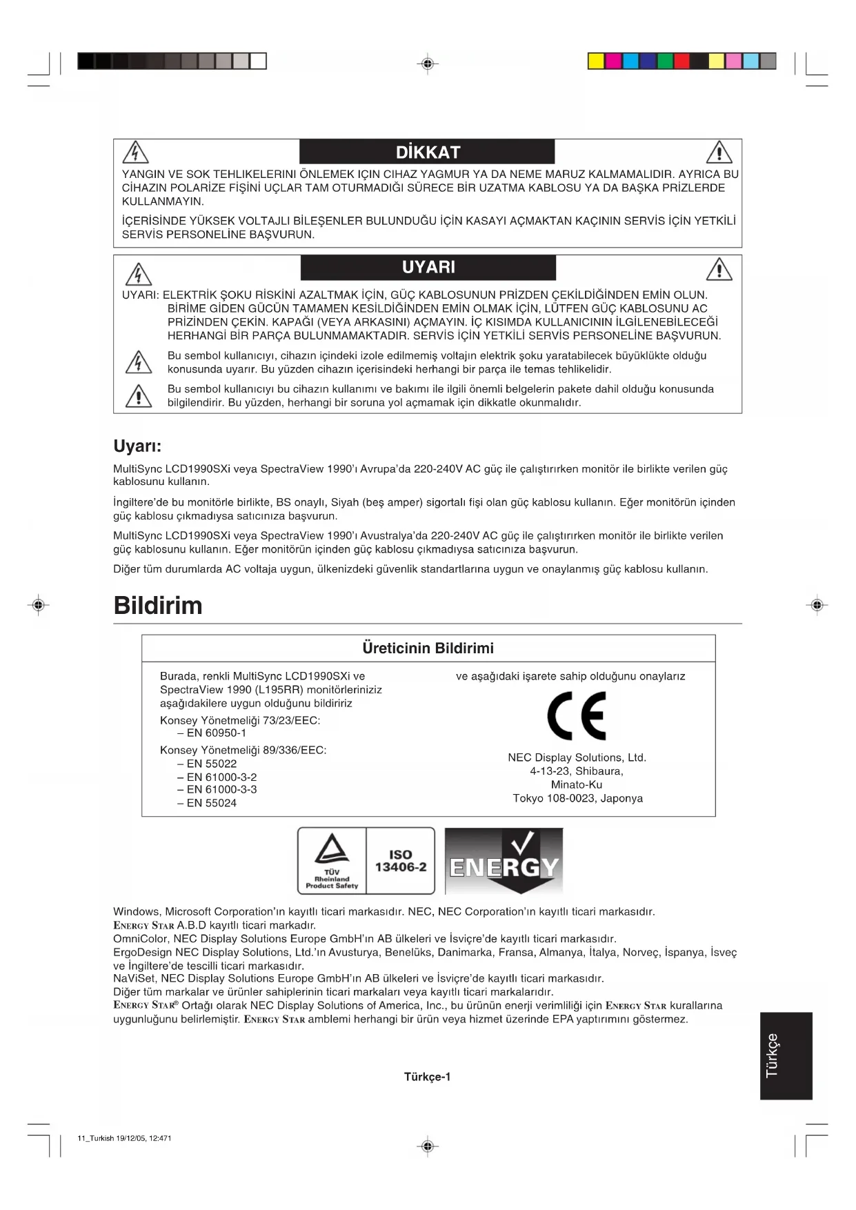 Orta©∂ olarak NEC Display Solutions of America, Inc., bu ürünün enerji verimlili©i için ENERGY STA R kurallar∂na uygunlu©unu belirlemiµtir. ENERGY STAR amblemi herhangi bir ürün veya hizmet üzerinde EPA yapt∂r∂m∂n∂ göstermez. 11_Turkish 19/12/05, 12:471Türkçe-2 ∑çindekiler Yeni NEC monitör kutunuz* aµa©∂dakileri içermelidir: