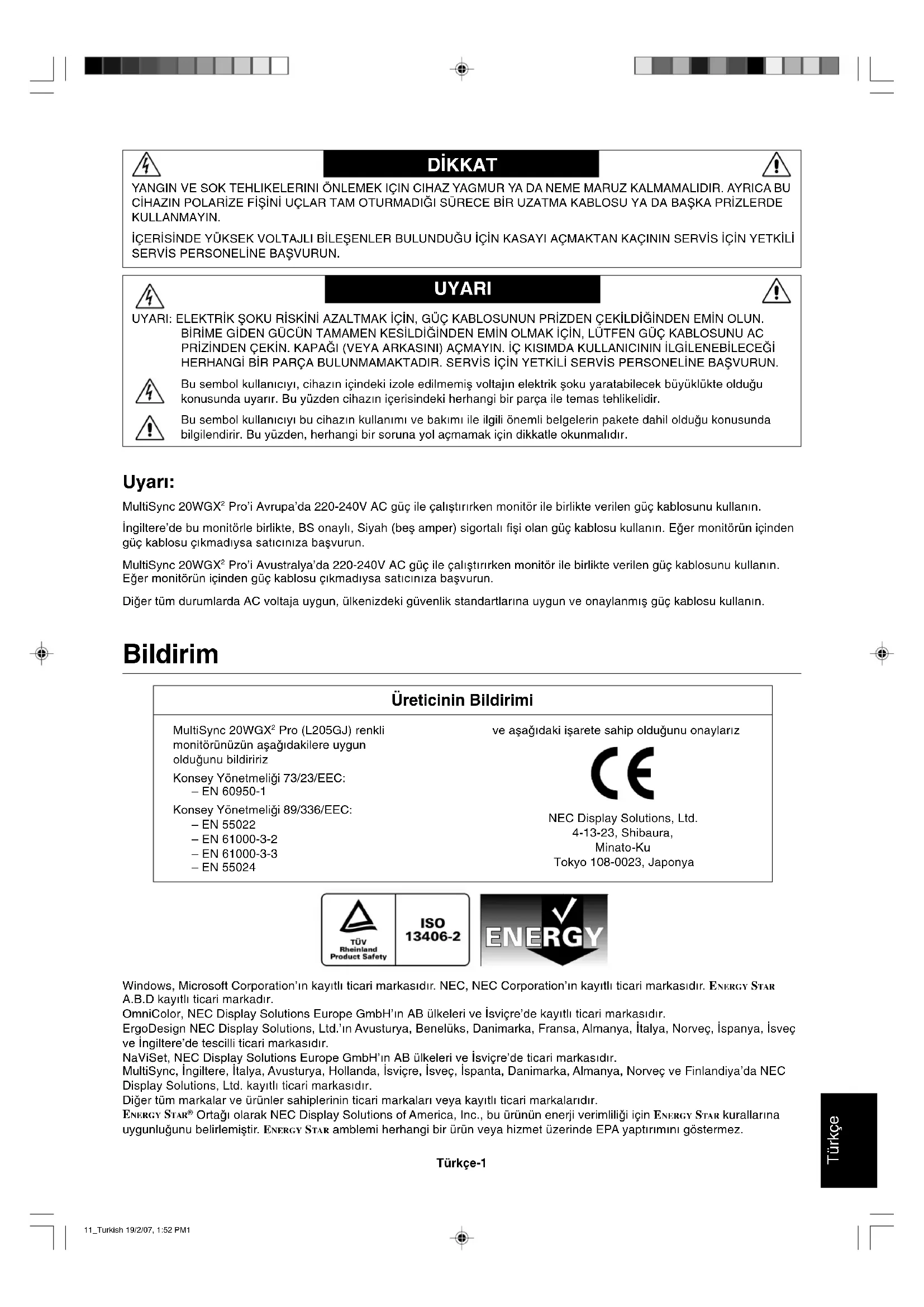 Pro’i Avustralya’da 220-240V AC güç ile çal∂µt∂r∂rken monitör ile birlikte verilen güç kablosunu kullan∂n. E©er monitörün içinden güç kablosu ç∂kmad∂ysa sat∂c∂n∂za baµvurun. Di©er tüm durumlarda AC voltaja uygun, ülkenizdeki güvenlik standartlar∂na uygun ve onaylanm∂µ güç kablosu kullan∂n. YANGIN VE SOK TEHLIKELERINI ÖNLEMEK IÇIN CIHAZ YAGMUR YA DA NEME MARUZ KALMAMALIDIR. AYRICA BU C∑HAZIN POLAR∑ZE F∑Ω∑N∑ UÇLAR TAM OTURMADI∏I SÜRECE B∑R UZATMA KABLOSU YA DA BAΩKA PR∑ZLERDE KULLANMAYIN. ∑ÇER∑S∑NDE YÜKSEK VOLTAJLI B∑LEΩENLER BULUNDU∏U ∑Ç∑N KASAYI AÇMAKTAN KAÇININ SERV∑S ∑Ç∑N YETK∑L∑ SERV∑S PERSONEL∑NE BAΩVURUN. Bildirim Üreticinin Bildirimi MultiSync 20WGX