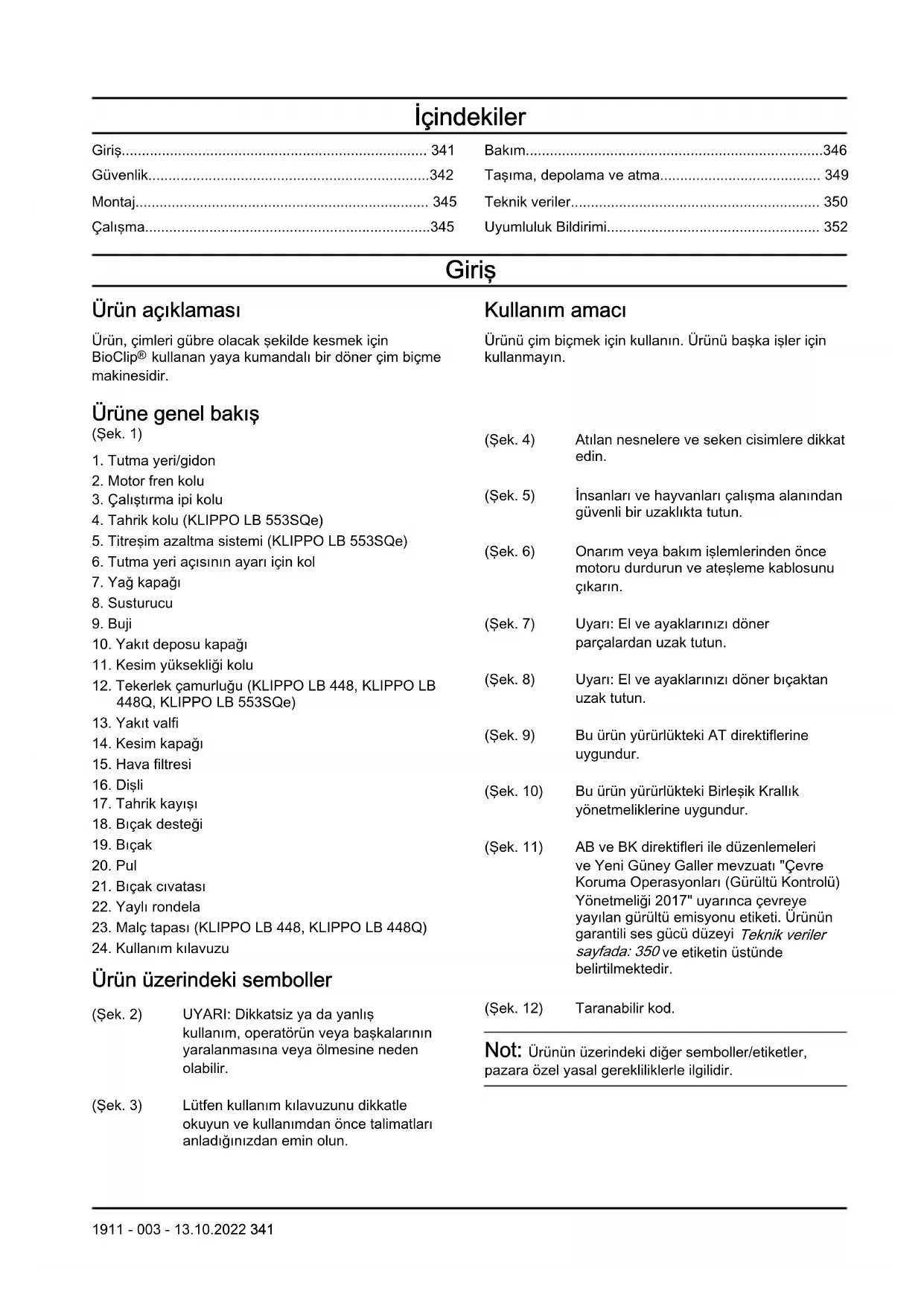Ürün üzerindeki semboller (Şek. 2) UYARI: Dikkatsiz ya da yanlış kullanım, operatörün veya başkalarının yaralanmasına veya ölmesine neden olabilir. (Şek. 3) Lütfen kullanım kılavuzunu dikkatle okuyun ve kullanımdan önce talimatları anladığınızdan emin olun. (Şek. 4) Atılan nesnelere ve seken cisimlere dikkat edin. (Şek. 5) İnsanları ve hayvanları çalışma alanından güvenli bir uzaklıkta tutun. (Şek. 6) Onarım veya bakım işlemlerinden önce motoru durdurun ve ateşleme kablosunu çıkarın. (Şek. 7) Uyarı: El ve ayaklarınızı döner parçalardan uzak tutun. (Şek. 8) Uyarı: El ve ayaklarınızı döner bıçaktan uzak tutun. (Şek. 9) Bu ürün yürürlükteki AT direktiflerine uygundur. (Şek. 10) Bu ürün yürürlükteki Birleşik Krallık yönetmeliklerine uygundur. (Şek. 11) AB ve BK direktifleri ile düzenlemeleri ve Yeni Güney Galler mevzuatı "Çevre Koruma Operasyonları (Gürültü Kontrolü) Yönetmeliği 2017" uyarınca çevreye yayılan gürültü emisyonu etiketi. Ürünün garantili ses gücü düzeyi Teknik veriler sayfada: 350 ve etiketin üstünde belirtilmektedir. (Şek. 12) Taranabilir kod. Not: Ürünün üzerindeki diğer semboller/etiketler, pazara özel yasal gerekliliklerle ilgilidir. 1911 - 003 - 13.10.2022 341Ürün üzerindeki etiket, sadece Avustralya ve Yeni Zelanda için geçerlidir (Şek. 13) El ve ayaklarınızı döner bıçaktan uzak tutun. Avrupa V Emisyonları UYARI: Motorun kurcalanması bu ürünün AB tip onayını geçersiz kılar. Ürün sorumluluğu Ürün sorumluluğu yasalarında belirtildiği üzere;