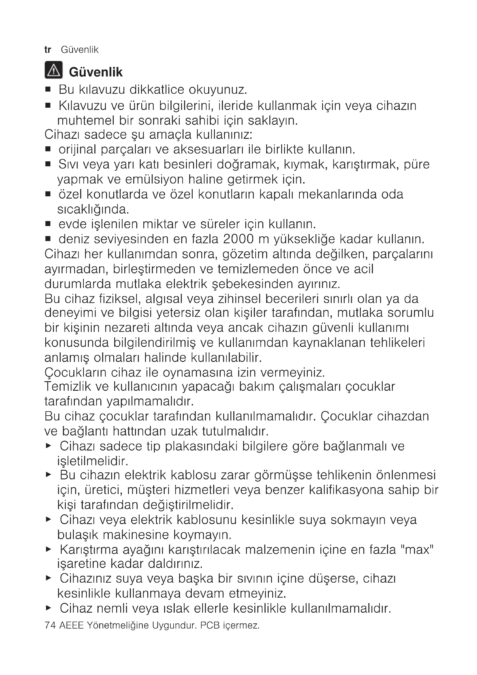 Λεπτομερείς πληροφορίες για τον χρόνο εγγύησης και τους όρους εγγύησης στη χώρα σας θα λάβετε από την υπηρεσία εξυπηρέτησης πελατών της εταιρείας μας, τον έμπορά σας ή την ιστοσελίδα μας.Υπηρεσία εξυπηρέτησης πελατών el Εκτυπωμένο σε 100 % ανακυκλωμένο χαρτί 73 Τα στοιχεία επικοινωνίας της υπηρεσίας εξυπηρέτησης πελατών θα τα βρείτε στον συνημμένο κατάλογο της υπηρεσίας εξυπηρέτησης πελατών ή στην ιστοσελίδα μας.tr Güvenlik 74 AEEE Yönetmeliǧine Uygundur. PCB içermez. Güvenlik ¡ Bu kılavuzu dikkatlice okuyunuz. ¡ Kılavuzu ve ürün bilgilerini, ileride kullanmak için veya cihazın muhtemel bir sonraki sahibi için saklayın. Cihazı sadece şu amaçla kullanınız: ¡ orijinal parçaları ve aksesuarları ile birlikte kullanın. ¡ Sıvı veya yarı katı besinleri doğramak, kıymak, karıştırmak, püre yapmak ve emülsiyon haline getirmek için. ¡ özel konutlarda ve özel konutların kapalı mekanlarında oda sıcaklığında. ¡ evde işlenilen miktar ve süreler için kullanın. ¡ deniz seviyesinden en fazla 2000m yüksekliğe kadar kullanın. Cihazı her kullanımdan sonra, gözetim altında değilken, parçalarını ayırmadan, birleştirmeden ve temizlemeden önce ve acil durumlarda mutlaka elektrik şebekesinden ayırınız. Bu cihaz fiziksel, algısal veya zihinsel becerileri sınırlı olan ya da deneyimi ve bilgisi yetersiz olan kişiler tarafından, mutlaka sorumlu bir kişinin nezareti altında veya ancak cihazın güvenli kullanımı konusunda bilgilendirilmiş ve kullanımdan kaynaklanan tehlikeleri anlamış olmaları halinde kullanılabilir. Çocukların cihaz ile oynamasına izin vermeyiniz. Temizlik ve kullanıcının yapacağı bakım çalışmaları çocuklar tarafından yapılmamalıdır. Bu cihaz çocuklar tarafından kullanılmamalıdır. Çocuklar cihazdan ve bağlantı hattından uzak tutulmalıdır. ▶ Cihazı sadece tip plakasındaki bilgilere göre bağlanmalı ve işletilmelidir. ▶ Bu cihazın elektrik kablosu zarar görmüşse tehlikenin önlenmesi için, üretici, müşteri hizmetleri veya benzer kalifikasyona sahip bir kişi tarafından değiştirilmelidir. ▶ Cihazı veya elektrik kablosunu kesinlikle suya sokmayın veya bulaşık makinesine koymayın. ▶ Karıştırma ayağını karıştırılacak malzemenin içine en fazla "max" işaretine kadar daldırınız. ▶ Cihazınız suya veya başka bir sıvının içine düşerse, cihazı kesinlikle kullanmaya devam etmeyiniz. ▶ Cihaz nemli veya ıslak ellerle kesinlikle kullanılmamalıdır.Maddi hasarların önlenmesi tr %100 geri dönüşümlü kağıt üzerine basılmıştır 75 ▶ Hasarlı cihazlar kesinlikle kullanılmamalıdır. ▶ Şebeke bağlantı kablosunu asla sıcak parçalara temas ettirmeyiniz veya keskin kenarlar üzerinden çekmeyiniz. ▶ Cihazı kesinlikle sıcak yüzeylerin üzerine veya yakınına koymayınız. ▶ Kapattıktan sonra tahrik sisteminin tamamen durmasını bekleyiniz. ▶ Ellerinizi, saçlarınızı, kıyafetlerinizi ve diğer kişisel eşyalarınızı döner parçalardan uzak tutun. ▶ Aksesuarı sadece tahrik duruyorken ve cihaz çıkartılmış durumdayken takın ve çıkartın. ▶ Aksesuarı sadece komple monte edilmiş şekilde kullanın. ▶ Bıçak ağızlarına asla çıplak elle dokunmayın. ▶ Kabı boşaltırken ve temizleme sırasında keskin bıçaklara dikkat ediniz. ▶ Sıcak yiyecekleri işlerken dikkatli olunuz. ▶ Kaynayan yiyecekleri işlemeden önce bunların 70°C'ye veya daha fazla soğumasını bekleyiniz. ▶ Temizlik bilgilerini dikkate alın. ▶ Gıda maddeleri ile temas eden yüzeyleri her kullanımdan önce temizleyin. Maddi hasarların önlenmesi ▶ Cihazı kesinlikle malzemesiz çalıştırmayın. ▶ Karıştırma kabını hiçbir zaman mikrodalga fırında veya normal fırında kullanmayın. ▶ Dişli düzeneklerini kesinlikle sıvıların içine daldırmayınız ve asla musluktan akan su altında veya bulaşık makinesinde temizlemeyiniz. ▶ Genel doğrayıcının kabını kesinlikle mikrodalga fırında veya fırında kullanmayınız. ▶ Genel doğrayıcının kabı içinde kesinlikle karıştırma ayağını veya çırpma telini kullanmayınız. ▶ Ana cihaz duyulur şekilde ve tam olarak karıştırma ayağı veya aksesuar üzerine yerine oturur. Genel bakış