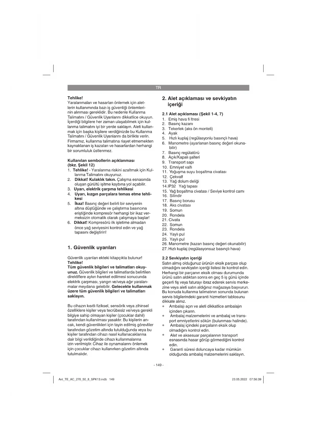Kompresörü işletime almadan önce kom- presör tarafından oluşturulan sıvıların defe- Anl_TE_AC_270_50_8_SPK13.indb 150Anl_TE_AC_270_50_8_SPK13.indb 150 23.05.2022 07:56:3923.05.2022 07:56:39TR