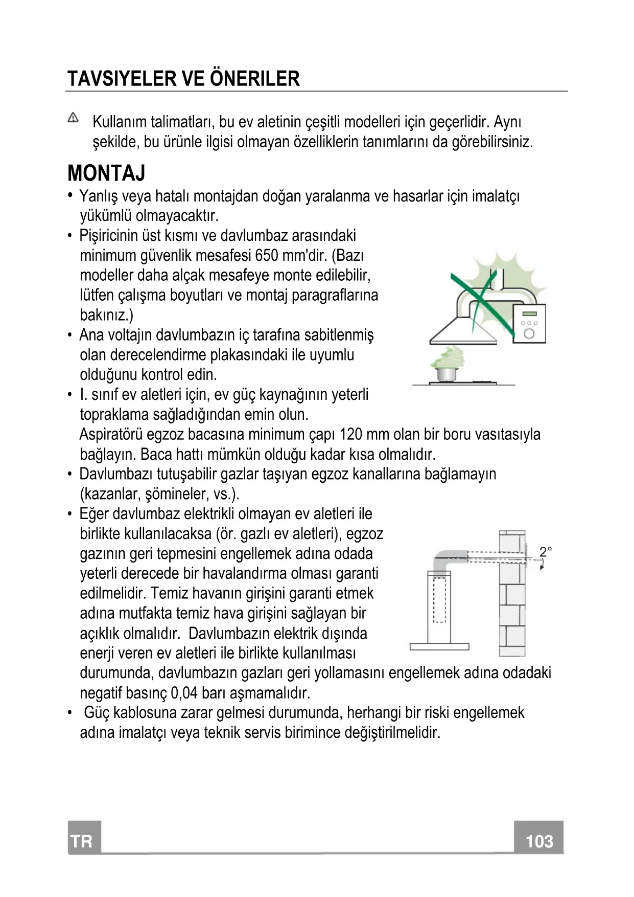 - Davlumbazı tutuşabilir gazlar taşıyan egzoz kanallarına bağlamayın (kazanlar, şömineler, vs.).