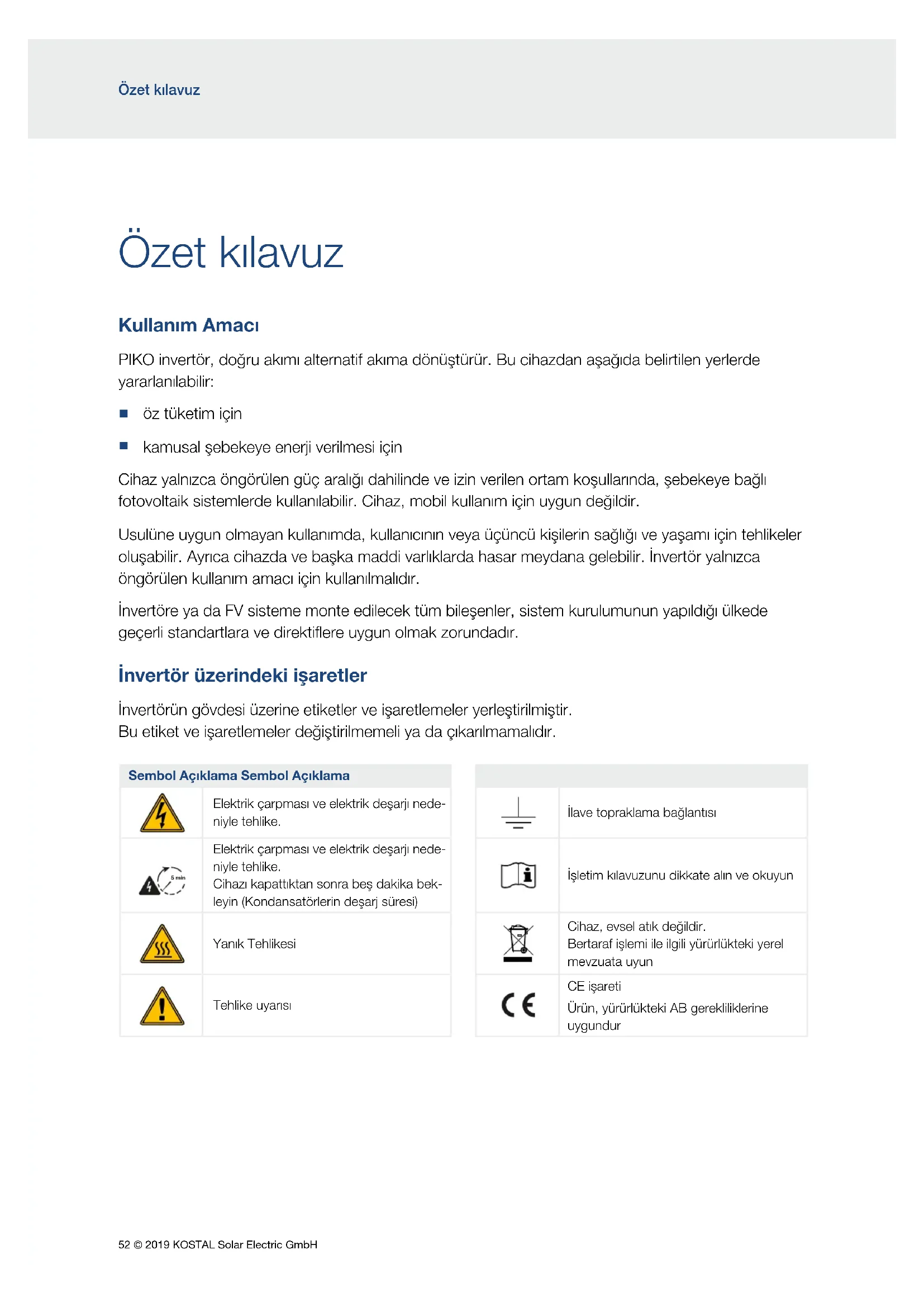 kamusal şebekeye enerji verilmesi için Cihaz yalnızca öngörülen güç aralığı dahilinde ve izin verilen ortam koşullarında, şebekeye bağlı fotovoltaik sistemlerde kullanılabilir. Cihaz, mobil kullanım için uygun değildir. Usulüne uygun olmayan kullanımda, kullanıcının veya üçüncü kişilerin sağlığı ve yaşamı için tehlikeler oluşabilir. Ayrıca cihazda ve başka maddi varlıklarda hasar meydana gelebilir. İnvertör yalnızca öngörülen kullanım amacı için kullanılmalıdır. İnvertöre ya da FV sisteme monte edilecek tüm bileşenler, sistem kurulumunun yapıldığı ülkede geçerli standartlara ve direktiflere uygun olmak zorundadır. İnvertör üzerindeki işaretler İnvertörün gövdesi üzerine etiketler ve işaretlemeler yerleştirilmiştir. Bu etiket ve işaretlemeler değiştirilmemeli ya da çıkarılmamalıdır. Sembol Açıklama Sembol Açıklama Elektrik çarpması ve elektrik deşarjı nede- niyle tehlike. İlave topraklama bağlantısı 5 min Elektrik çarpması ve elektrik deşarjı nede- niyle tehlike. Cihazı kapattıktan sonra beş dakika bek- leyin (Kondansatörlerin deşarj süresi) İşletim kılavuzunu dikkate alın ve okuyun 5 min Yanık Tehlikesi Cihaz, evsel atık değildir. Bertaraf işlemi ile ilgili yürürlükteki yerel mevzuata uyun Tehlike uyarısı CE işareti Ürün, yürürlükteki AB gerekliliklerine uygundur© 2019 KOSTAL Solar Electric GmbH 53