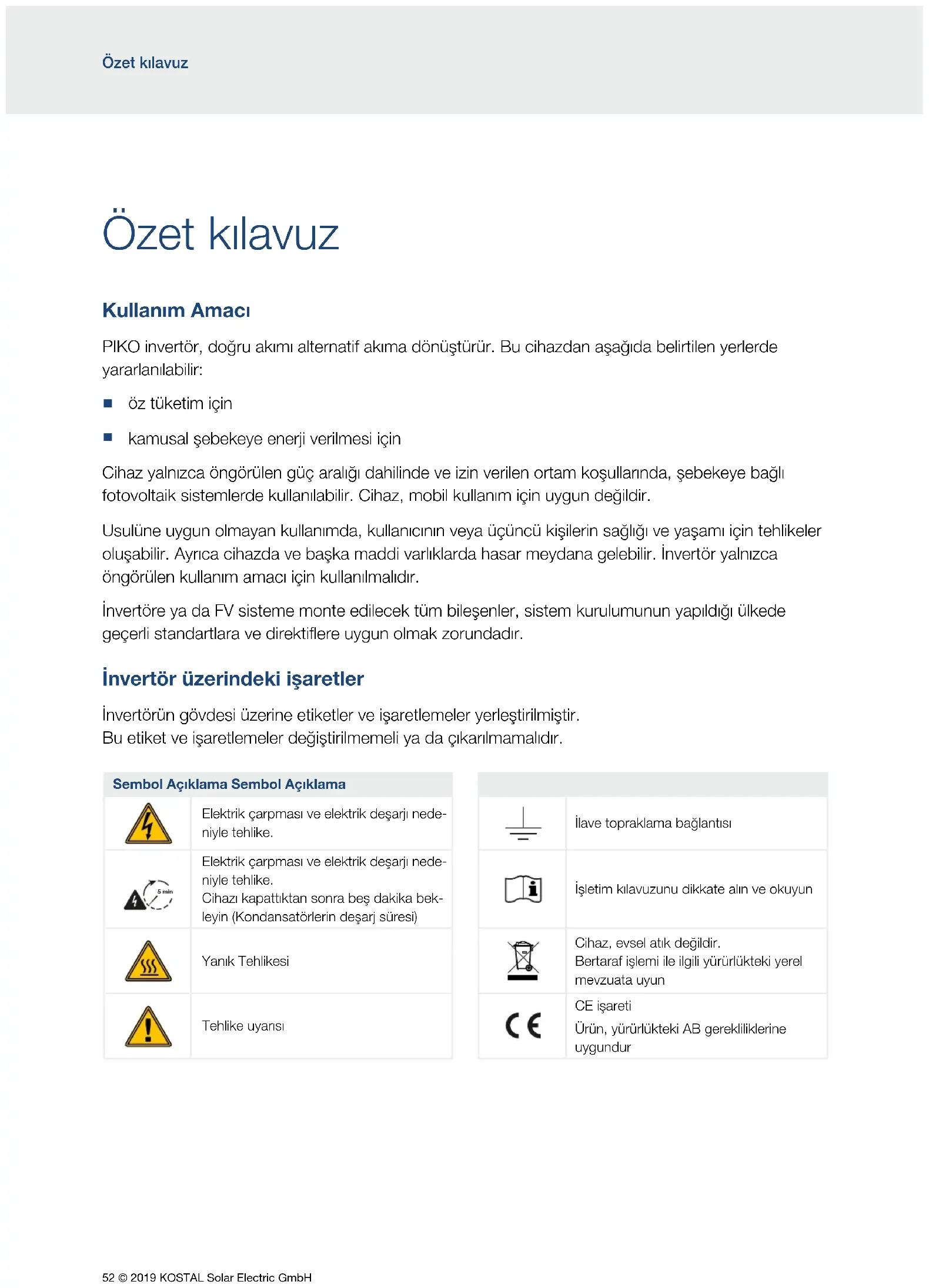 kamusal şebekeye enerji verilmesi için Cihaz yalnızca öngörülen güç aralığı dahilinde ve izin verilen ortam koşullarında, şebekeye bağlı fotovoltaik sistemlerde kullanılabilir. Cihaz, mobil kullanım için uygun değildir. Usulüne uygun olmayan kullanımda, kullanıcının veya üçüncü kişilerin sağlığı ve yaşamı için tehlikeler oluşabilir. Ayrıca cihazda ve başka maddi varlıklarda hasar meydana gelebilir. İnvertör yalnızca öngörülen kullanım amacı için kullanılmalıdır. İnvertöre ya da FV sisteme monte edilecek tüm bileşenler, sistem kurulumunun yapıldığı ülkede geçerli standartlara ve direktiflere uygun olmak zorundadır. İnvertör üzerindeki işaretler İnvertörün gövdesi üzerine etiketler ve işaretlemeler yerleştirilmiştir. Bu etiket ve işaretlemeler değiştirilmemeli ya da çıkarılmamalıdır. Sembol Açıklama Sembol Açıklama Elektrik çarpması ve elektrik deşarjı nede- niyle tehlike. İlave topraklama bağlantısı 5 min Elektrik çarpması ve elektrik deşarjı nede- niyle tehlike. Cihazı kapattıktan sonra beş dakika bek- leyin (Kondansatörlerin deşarj süresi) İşletim kılavuzunu dikkate alın ve okuyun 5 min Yanık Tehlikesi Cihaz, evsel atık değildir. Bertaraf işlemi ile ilgili yürürlükteki yerel mevzuata uyun Tehlike uyarısı CE işareti Ürün, yürürlükteki AB gerekliliklerine uygundur© 2019 KOSTAL Solar Electric GmbH 53